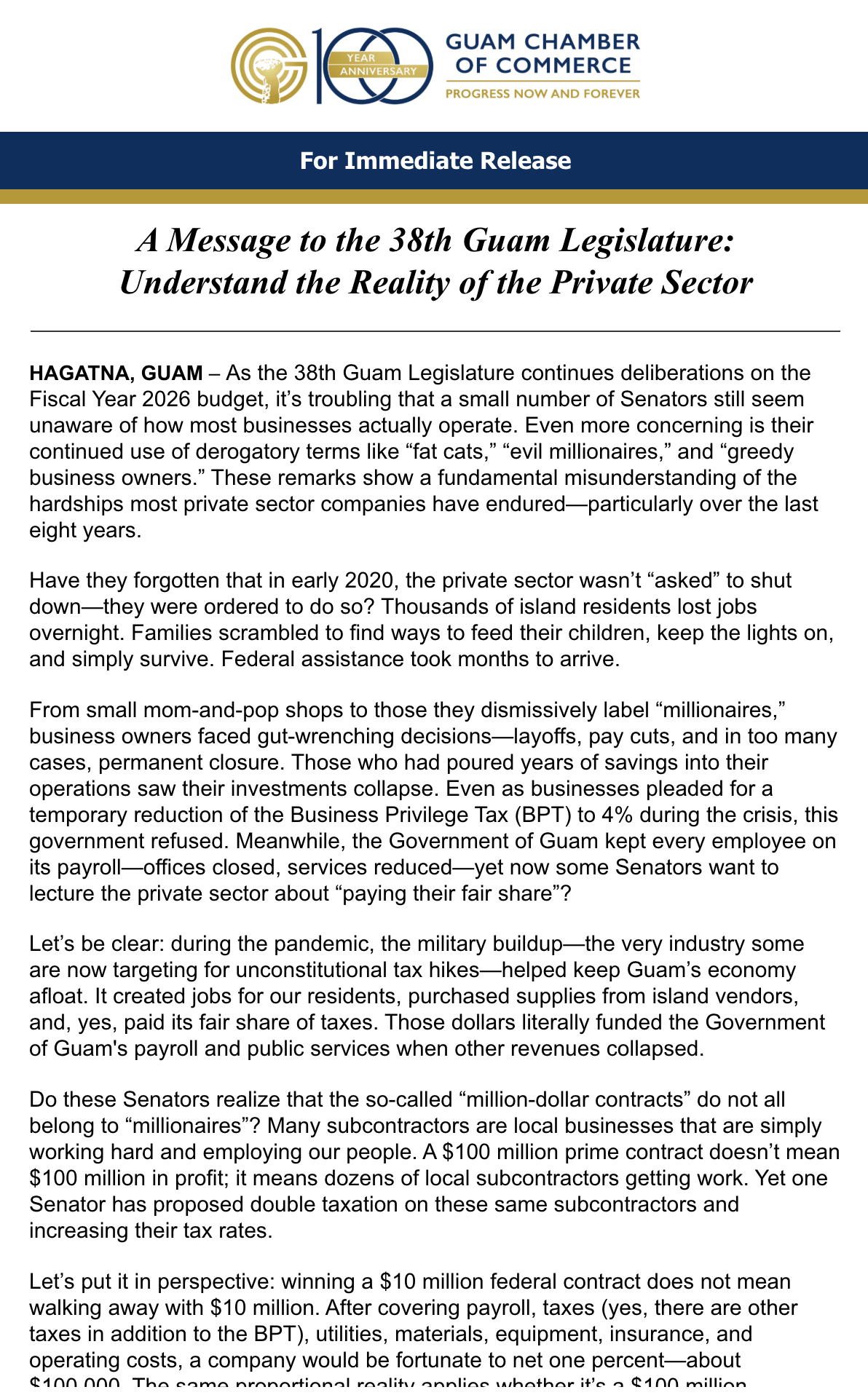 A Message to the 38th Guam Legislature: Understand the Reality of the Private Sector