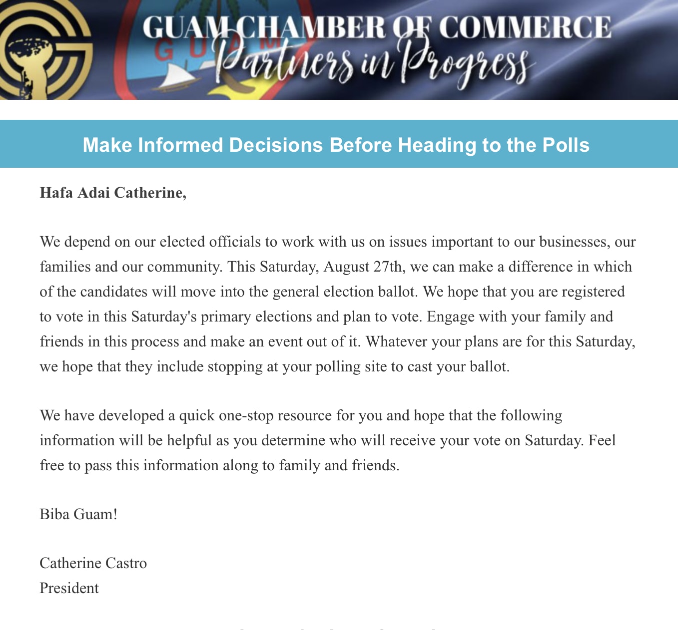 🗳Believe it or not... Back to Chamber News 🗳Believe it or not... By Guam Chamber of Commerce 8/23/2022 Your voice matters, please vote! Click to view Images × Share × Email Facebook LinkedIn X Pinterest Powered By GrowthZone