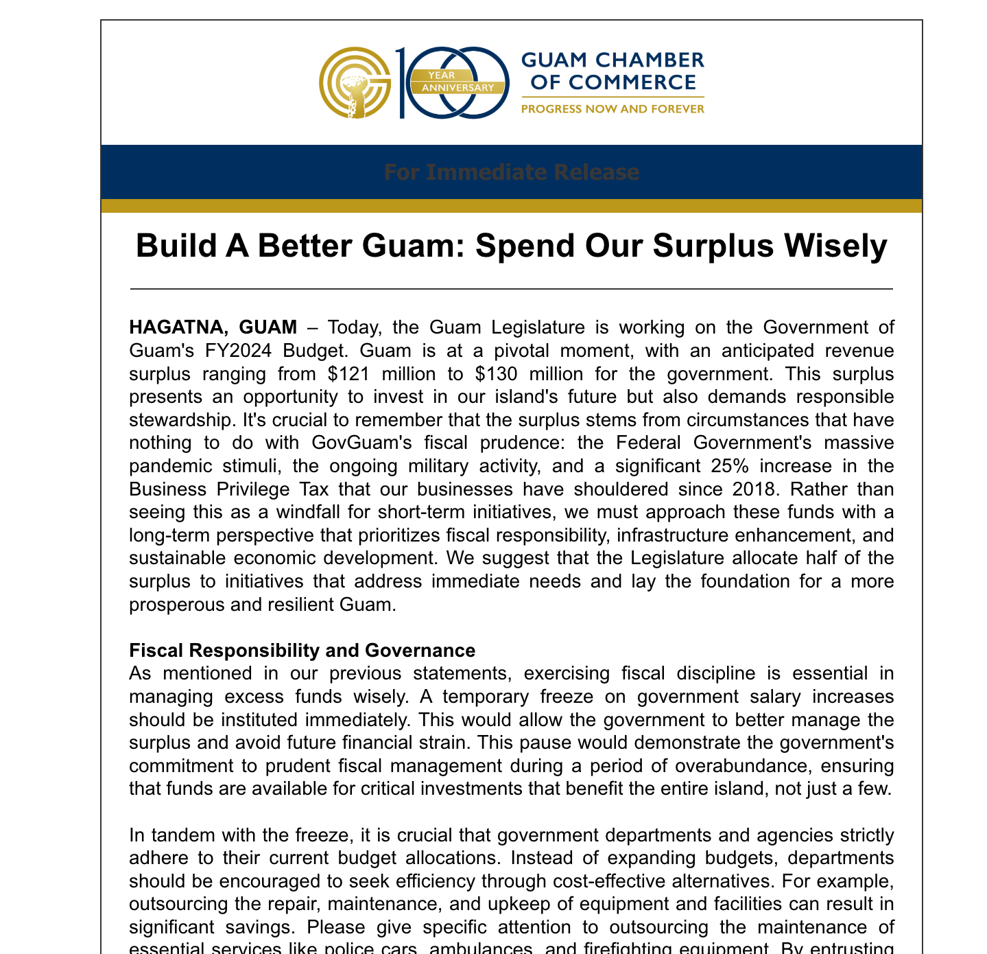 Build A Better Guam: Spend Our Surplus Wisely Back to Chamber News Build A Better Guam: Spend Our Surplus Wisely By Guam Chamber of Commerce 8/22/2024 Friday, August 23, 2024 Release Click here to view news release! Images × Share × Email Facebook LinkedIn X Pinterest Powered By GrowthZone