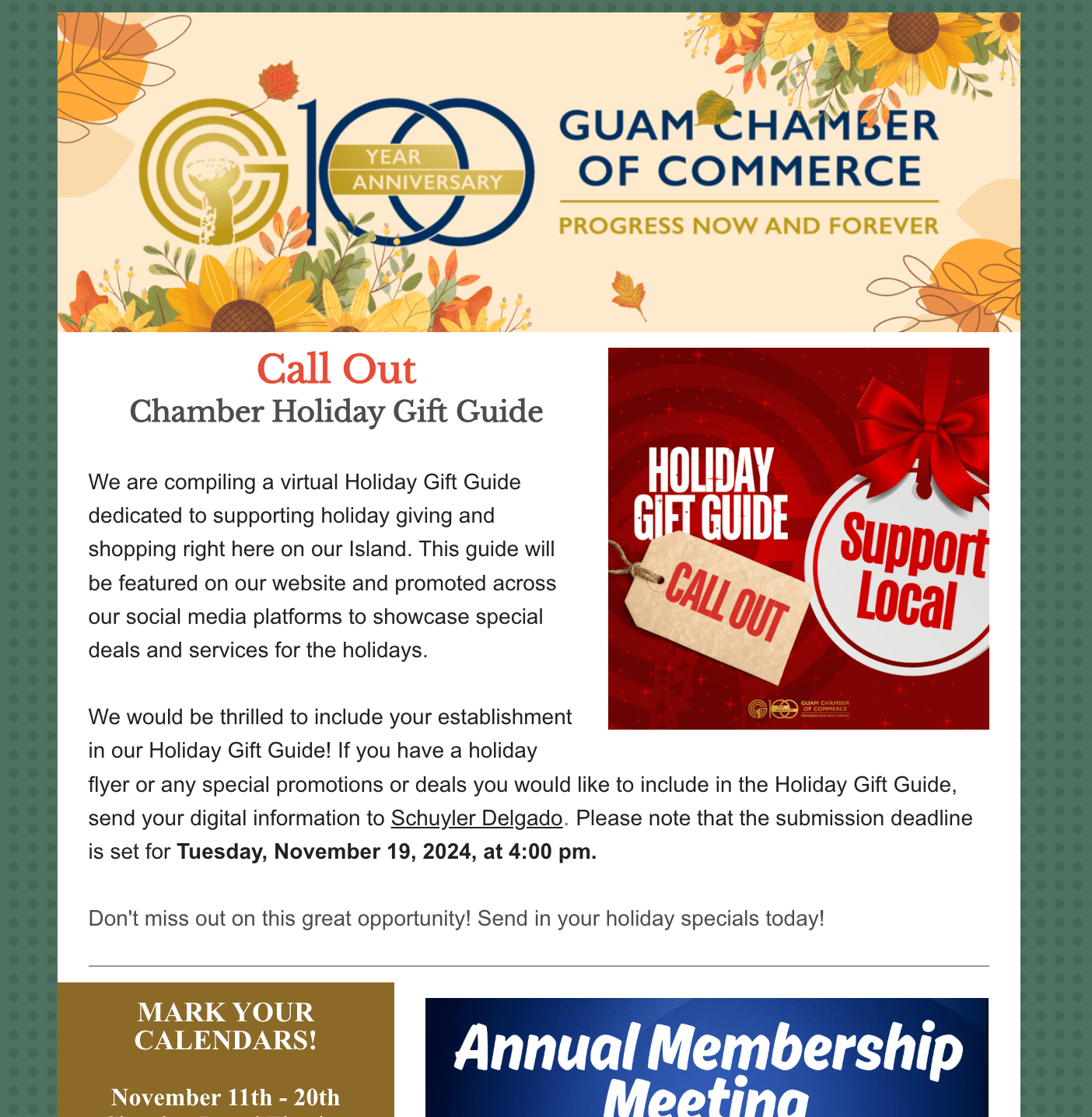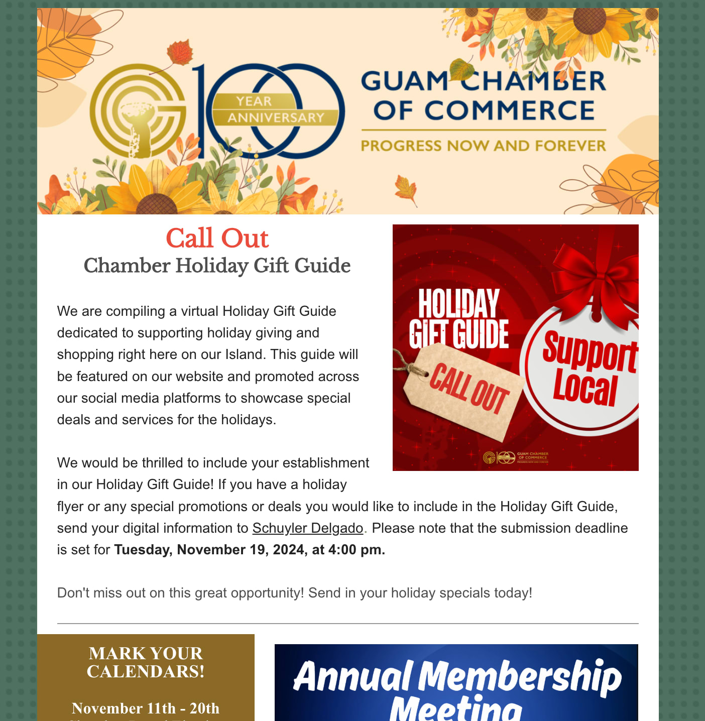 Calendar Bites Just For You! - Look Out Weekend! Back to Chamber News Calendar Bites Just For You! - Look Out Weekend! By Guam Chamber of Commerce 11/15/2024 Saturday, November 16, 2024 Click here to view the newsletter! Images × Share × Email Facebook LinkedIn X Pinterest Powered By GrowthZone