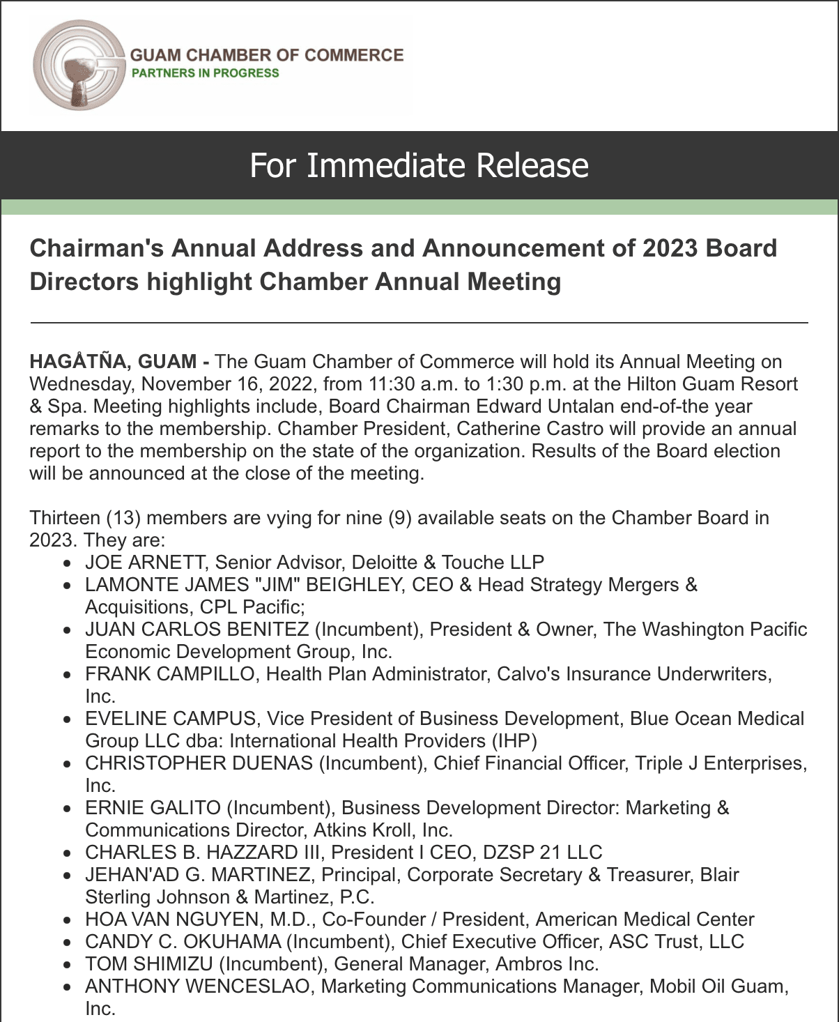 Chairman's Annual Address and Announcement of 2023 Board Directors highlight Chamber Annual Meeting