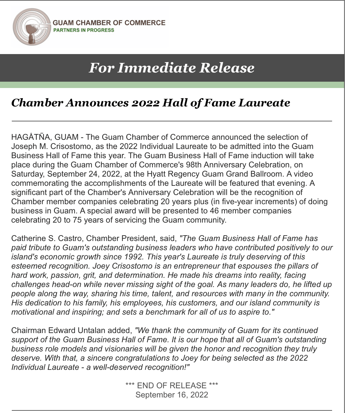 Chamber Announces 2022 Hall of Fame Laureate Back to Chamber News Chamber Announces 2022 Hall of Fame Laureate By Guam Chamber of Commerce 9/15/2022 September 16, 2022 Click to view press release! Images × Share × Email Facebook LinkedIn X Pinterest Powered By GrowthZone