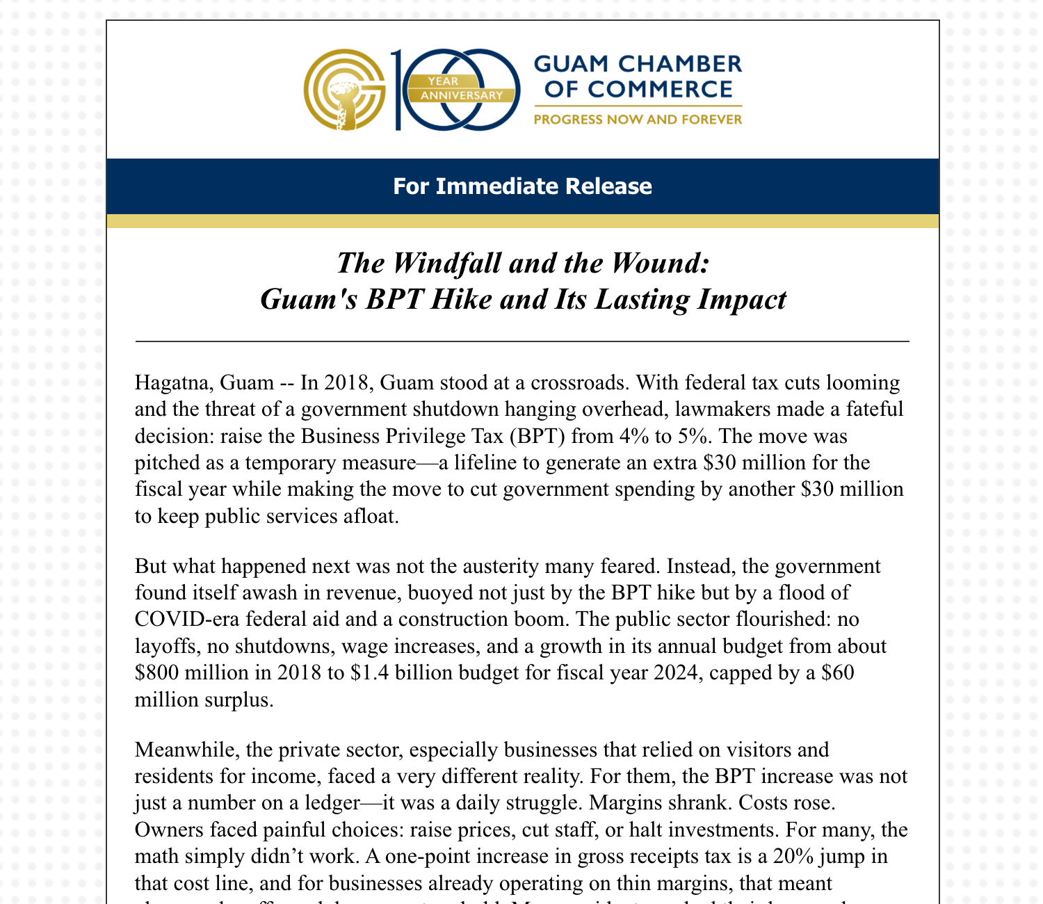 Chamber Release: The Windfall and the Wound: Guam's BPT Hike and Its Lasting Impact Back to Chamber News Chamber Release: The Windfall and the Wound: Guam's BPT Hike and Its Lasting Impact By Guam Chamber of Commerce 5/25/2025 May 26, 2025 Release Click here to view news release! Images × Share × Email Facebook LinkedIn X Pinterest Powered By GrowthZone