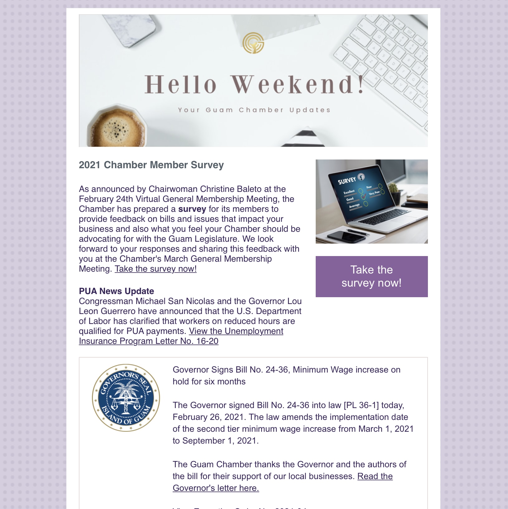 Chamber Survey & Lean Updates! Back to Chamber News Chamber Survey & Lean Updates! By Guam Chamber of Commerce 2/28/2021 February 27, 2021 View the newsletter here! Images × Share × Email Facebook LinkedIn X Pinterest Powered By GrowthZone