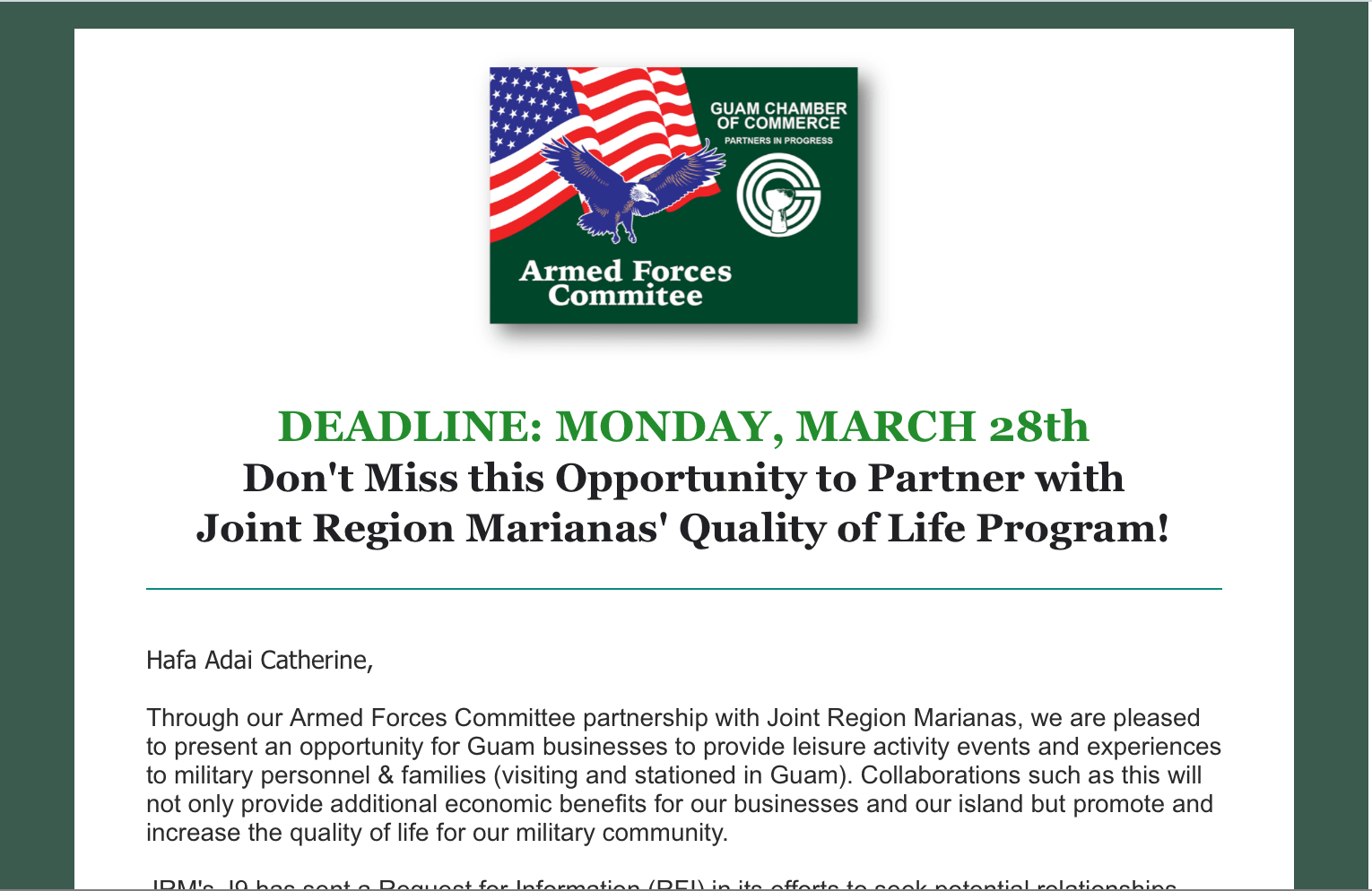 DEADLINE on MONDAY! Joint Region Marianas' Quality of Life Program Back to Chamber News DEADLINE on MONDAY! Joint Region Marianas' Quality of Life Program By Guam Chamber of Commerce 3/24/2022 March 25, 2022 View the newsletter! Images × Share × Email Facebook LinkedIn X Pinterest Powered By GrowthZone
