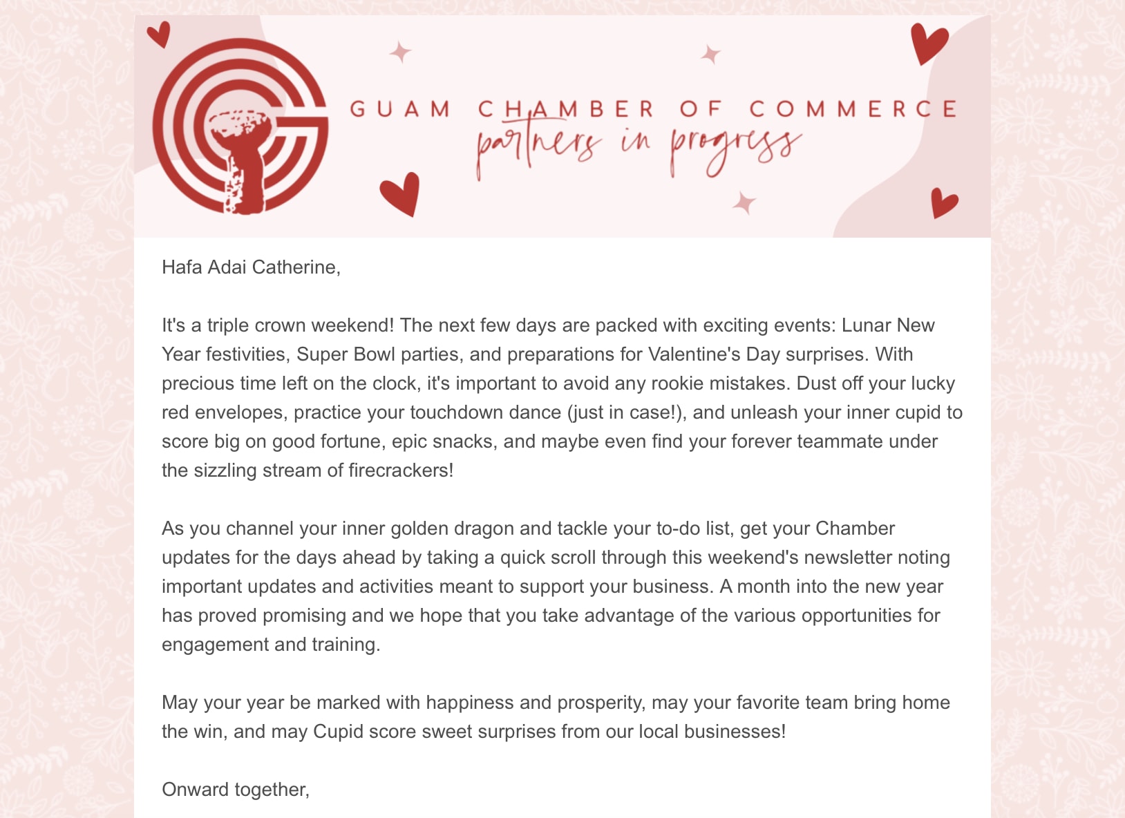 Dragons 🐉 Chiefs 🏈 49ers 🏟️ and Cupid 💞, Oh My... - Big Weekend Updates! Back to Chamber News Dragons 🐉 Chiefs 🏈 49ers 🏟️ and Cupid 💞, Oh My... - Big Weekend Updates! By Guam Chamber of Commerce 2/9/2024 Saturday, February 10, 2024 Click here to view the newsletter! Images × Share × Email Facebook LinkedIn X Pinterest Powered By GrowthZone