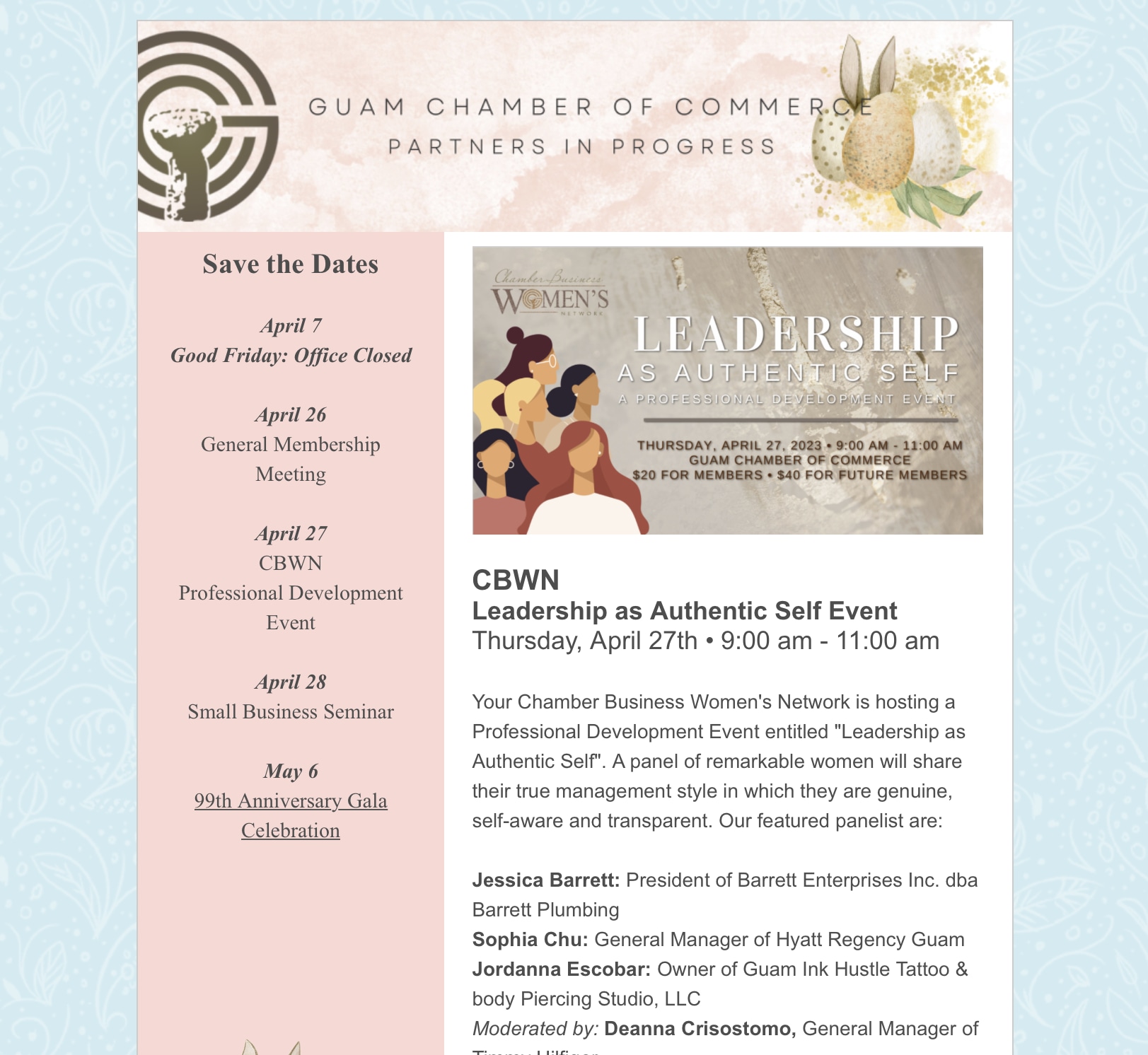 Egg-citing Month Ahead! - Happy Easter 🐇⛅️ Back to Chamber News Egg-citing Month Ahead! - Happy Easter 🐇⛅️ By Guam Chamber of Commerce 4/6/2023 Friday, April 7th View the newsletter! Images × Share × Email Facebook LinkedIn X Pinterest Powered By GrowthZone