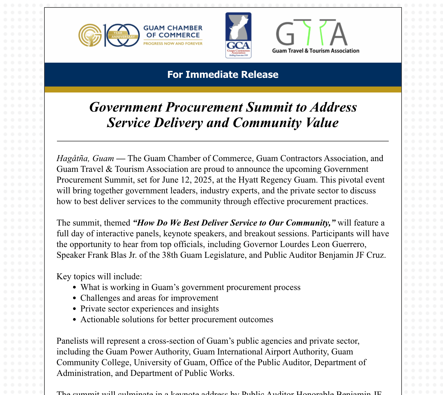 Government Procurement Summit to Address Service Delivery and Community Value Back to Chamber News Government Procurement Summit to Address Service Delivery and Community Value By Guam Chamber of Commerce 6/6/2025 June 7, 2025 Release Click here to view the news release! Images × Share × Email Facebook LinkedIn X Pinterest Powered By GrowthZone
