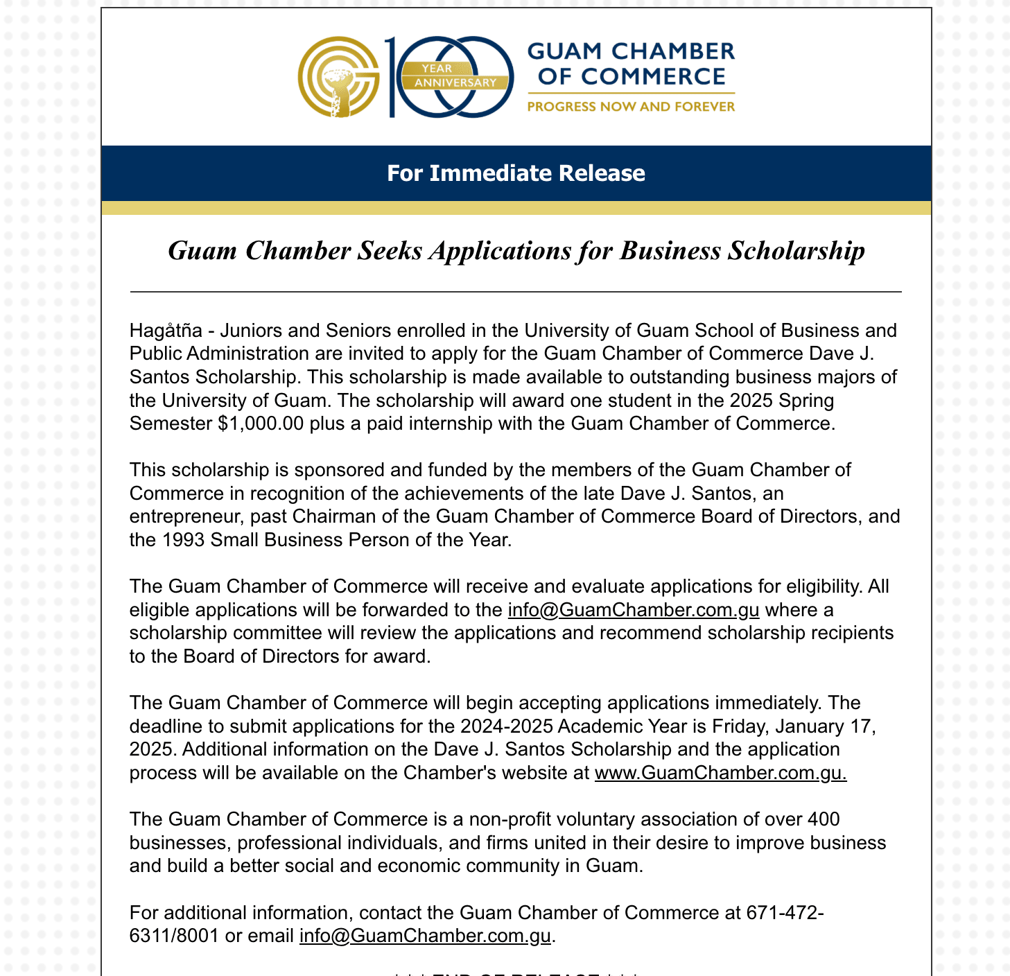 Guam Chamber Seeks Applications for Business Scholarship Back to Chamber News Guam Chamber Seeks Applications for Business Scholarship By Guam Chamber of Commerce 12/17/2024 December 18, 2024 Release Click here to view press release! Images × Share × Email Facebook LinkedIn X Pinterest Powered By GrowthZone