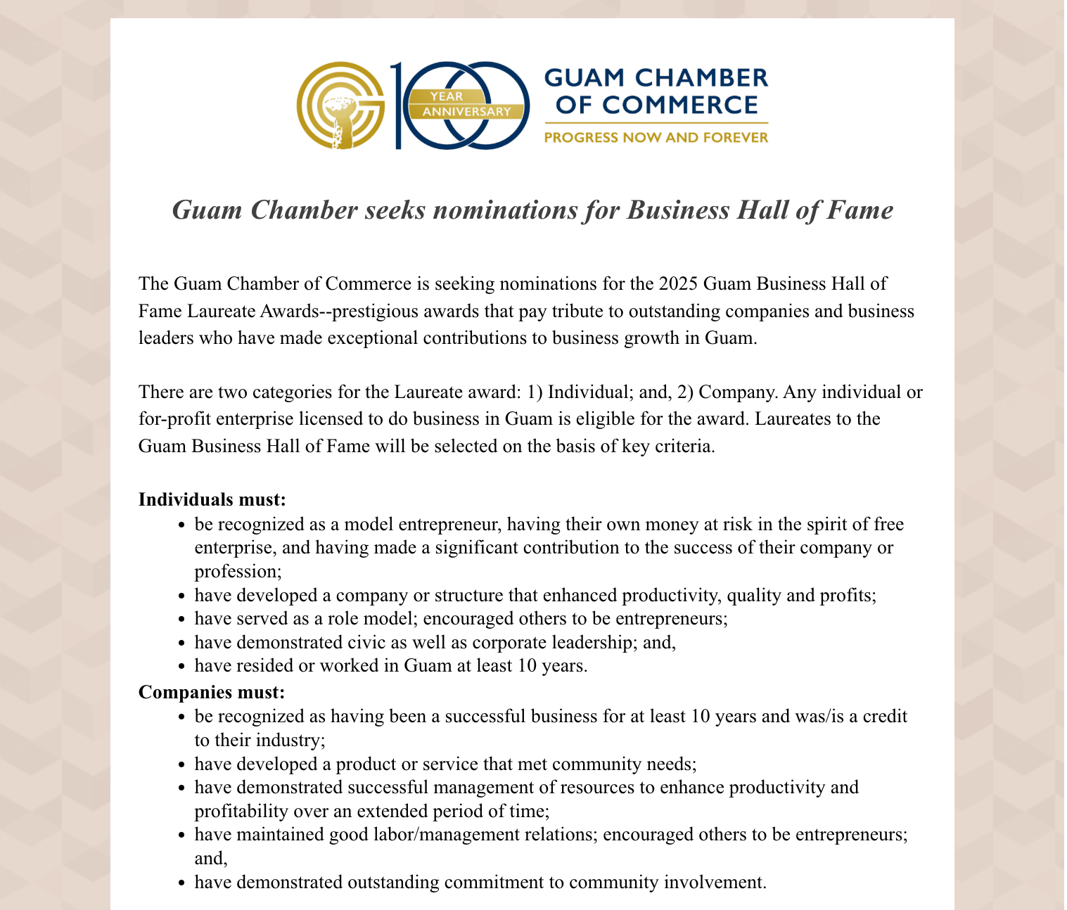 Guam Chamber seeks nominations for Business Hall of Fame - Submit your packet today! Back to Chamber News Guam Chamber seeks nominations for Business Hall of Fame - Submit your packet today! By Guam Chamber of Commerce 1/8/2025 Release January 9, 2025 Click here to view news release! Images × Share × Email Facebook LinkedIn X Pinterest Powered By GrowthZone