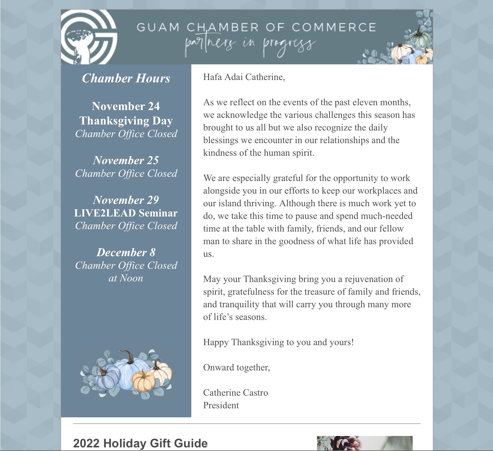 Happy Thanksgiving 🍁 - Sneak Peak @ Weekend Updates 🍂 Back to Chamber News Happy Thanksgiving 🍁 - Sneak Peak @ Weekend Updates 🍂 By Guam Chamber of Commerce 11/22/2022 November 23, 2022 View the newsletter! Images × Share × Email Facebook LinkedIn X Pinterest Powered By GrowthZone