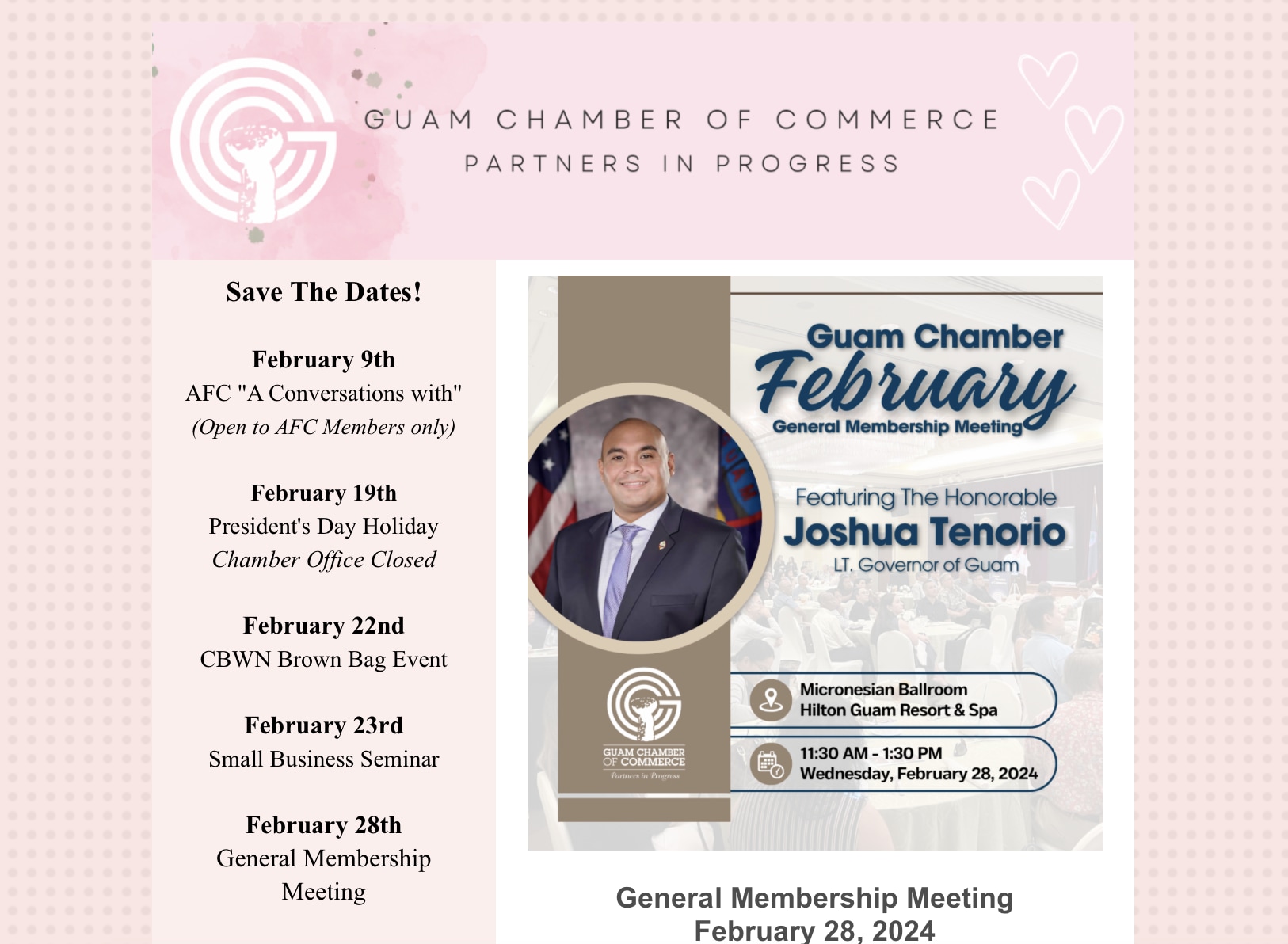 Hello February! 👋 - The year is just getting started! Back to Chamber News Hello February! 👋 - The year is just getting started! By Guam Chamber of Commerce 2/2/2024 Saturday, February 3, 2024 Click here to view newsletter! Images × Share × Email Facebook LinkedIn X Pinterest Powered By GrowthZone