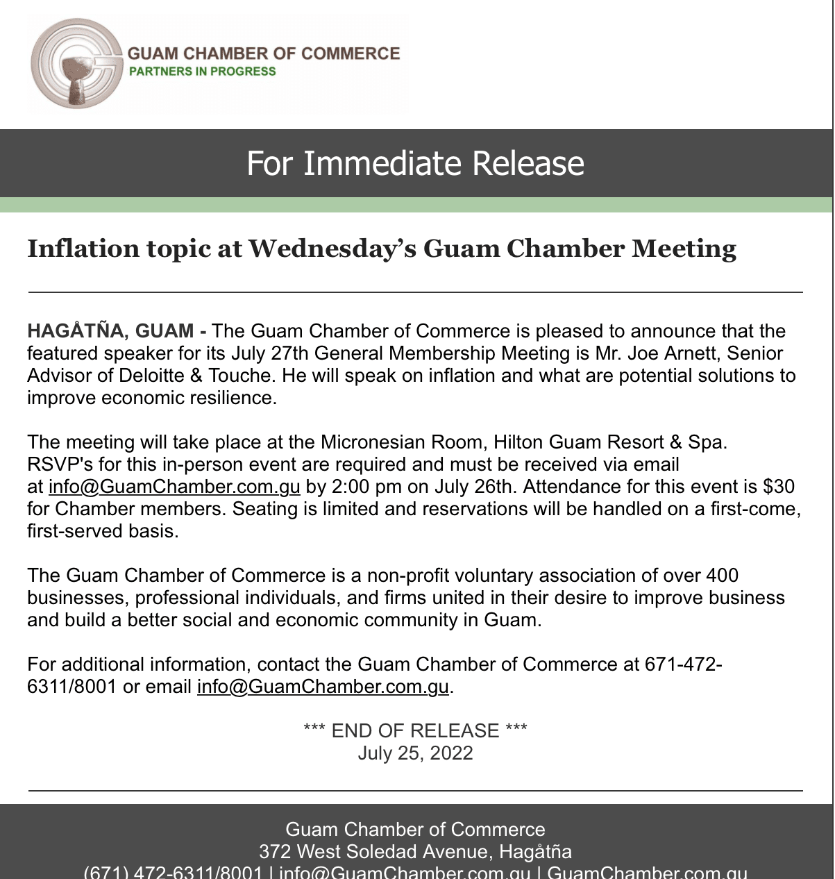 Inflation topic at Wednesday’s Guam Chamber Meeting Back to Chamber News Inflation topic at Wednesday’s Guam Chamber Meeting By Guam Chamber of Commerce 7/24/2022 July 25, 2022 View the press release Images × Share × Email Facebook LinkedIn X Pinterest Powered By GrowthZone