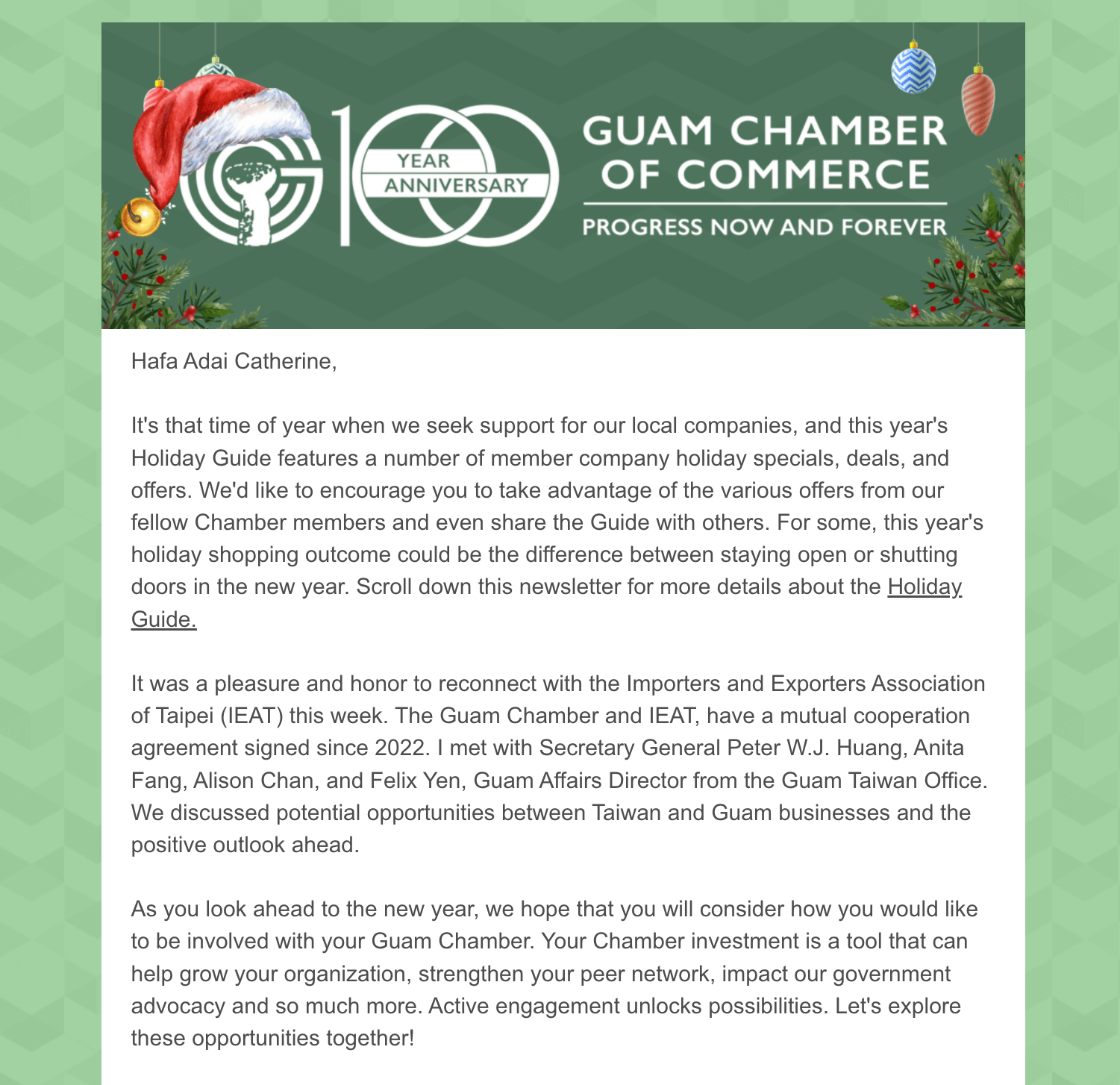 Into the Holidays We Go! 🎄 - Click Now for Updates, Holiday Guide II & More! Back to Chamber News Into the Holidays We Go! 🎄 - Click Now for Updates, Holiday Guide II & More! By Guam Chamber of Commerce 12/6/2024 Saturday, December 7, 2024 Click here to view newsletter! Images × Share × Email Facebook LinkedIn X Pinterest Powered By GrowthZone