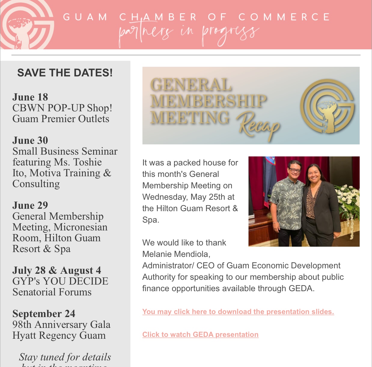 Looking ahead 👀 Back to Chamber News Looking ahead 👀 By Guam Chamber of Commerce 5/26/2022 May 27, 2022 View the newsletter! Images × Share × Email Facebook LinkedIn X Pinterest Powered By GrowthZone