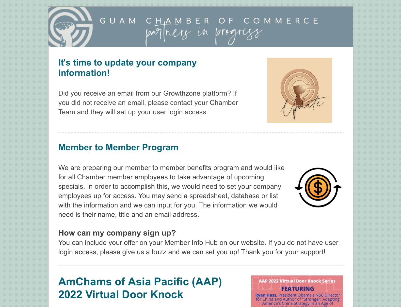 Mark your March Calendar Back to Chamber News Mark your March Calendar By Guam Chamber of Commerce 3/3/2022 March 4, 2022 View the newsletter here! Images × Share × Email Facebook LinkedIn X Pinterest Powered By GrowthZone