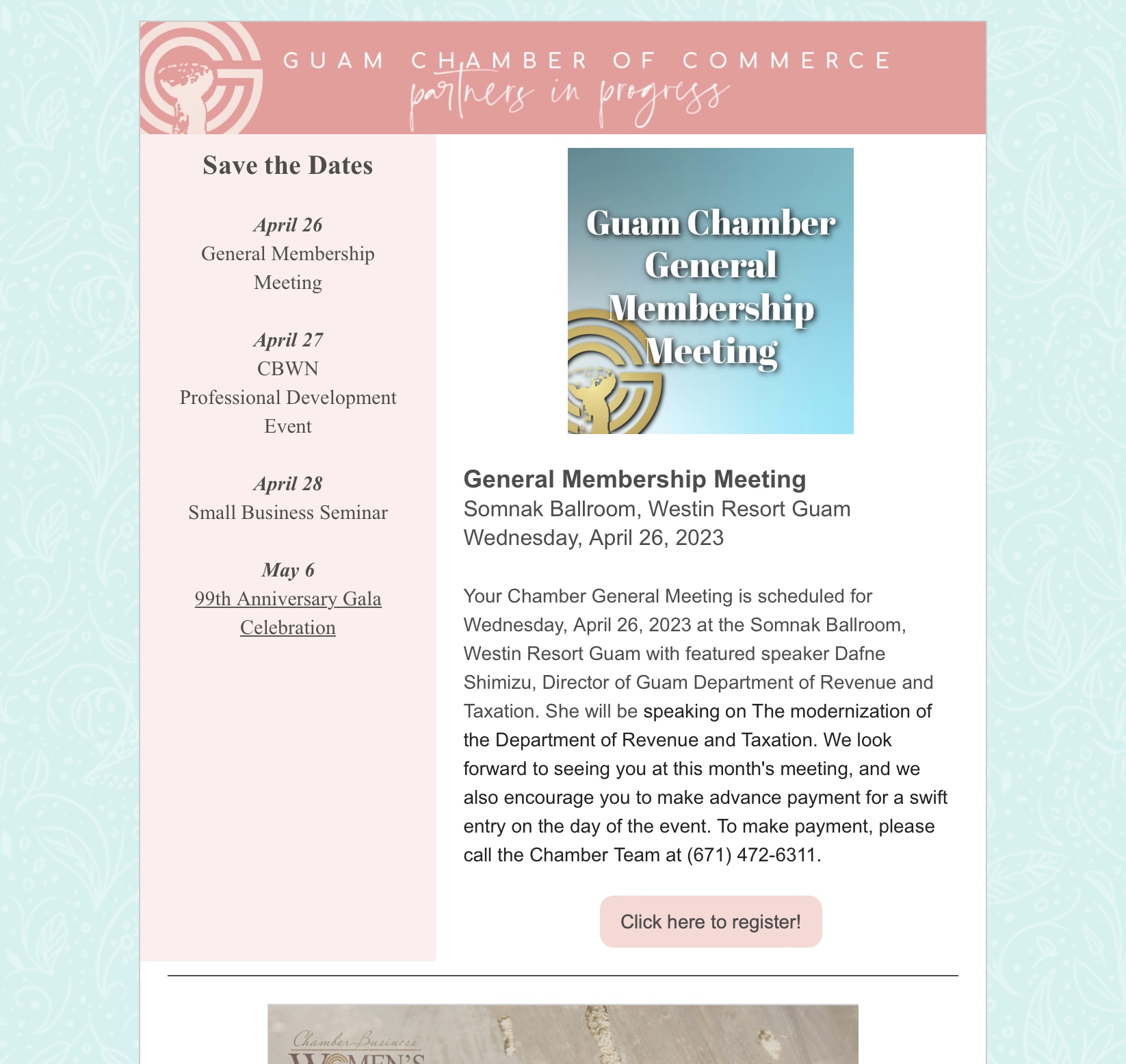 Mid-Month Updates! - Have a safe weekend ⛅️ Back to Chamber News Mid-Month Updates! - Have a safe weekend ⛅️ By Guam Chamber of Commerce 4/14/2023 Saturday, April 15, 2023 View the newsletter! Images × Share × Email Facebook LinkedIn X Pinterest Powered By GrowthZone