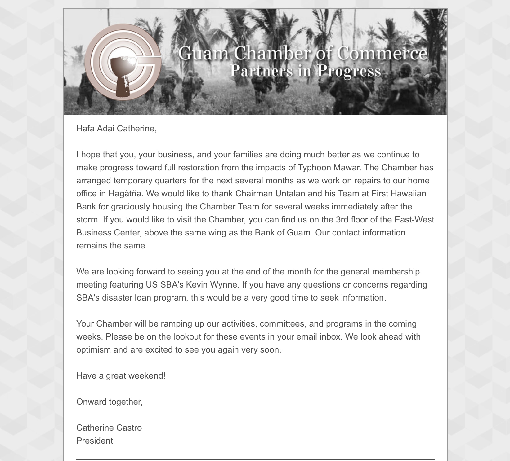 Mid Month Updates! - Look ahead Back to Chamber News Mid Month Updates! - Look ahead By Guam Chamber of Commerce 7/14/2023 Saturday, July 15, 2023 View the newsletter! Images × Share × Email Facebook LinkedIn X Pinterest Powered By GrowthZone