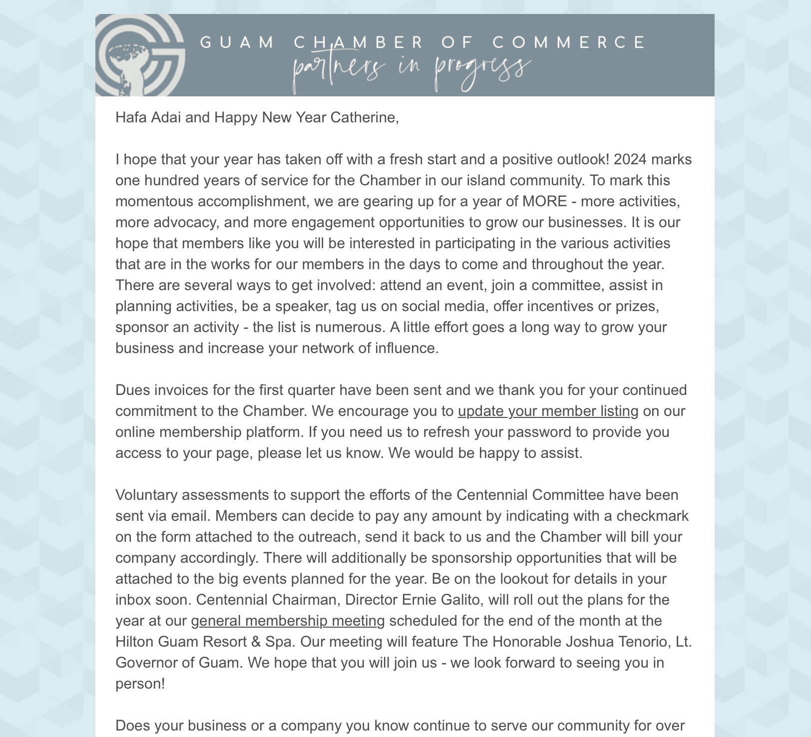 N E W Y E A R... F R E S H S T A R T 💫 - Let's get it started! Back to Chamber News N E W Y E A R... F R E S H S T A R T 💫 - Let's get it started! By Guam Chamber of Commerce 1/5/2024 Saturday, January 6, 2024 Click here to view the newsletter! Images × Share × Email Facebook LinkedIn X Pinterest Powered By GrowthZone