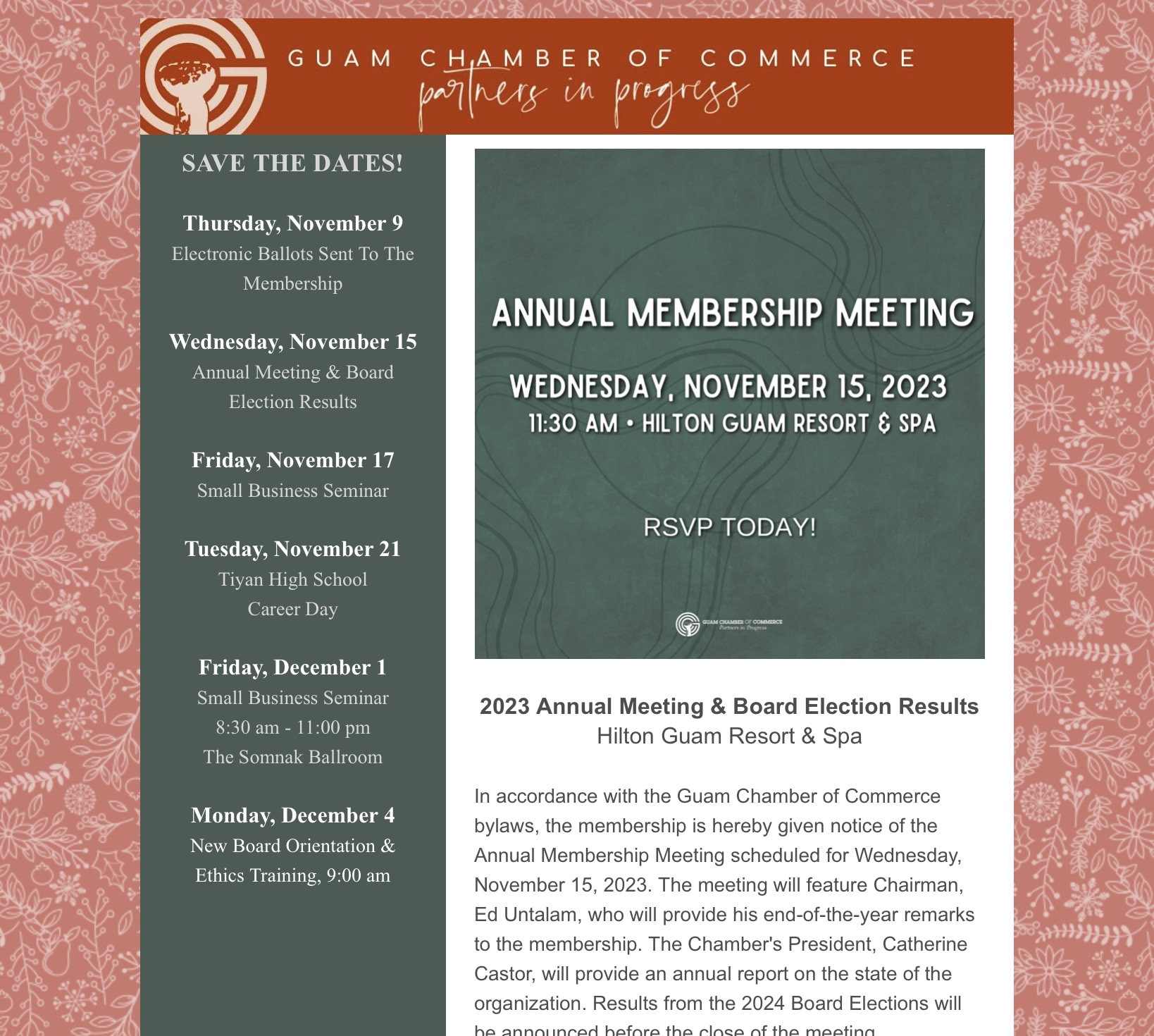 News Updates Just For You! 🥧 - Welcome November! 🍂 Back to Chamber News News Updates Just For You! 🥧 - Welcome November! 🍂 By Guam Chamber of Commerce 11/3/2023 Saturday, November 4, 2023 Click here to view newsletter! Images × Share × Email Facebook LinkedIn X Pinterest Powered By GrowthZone