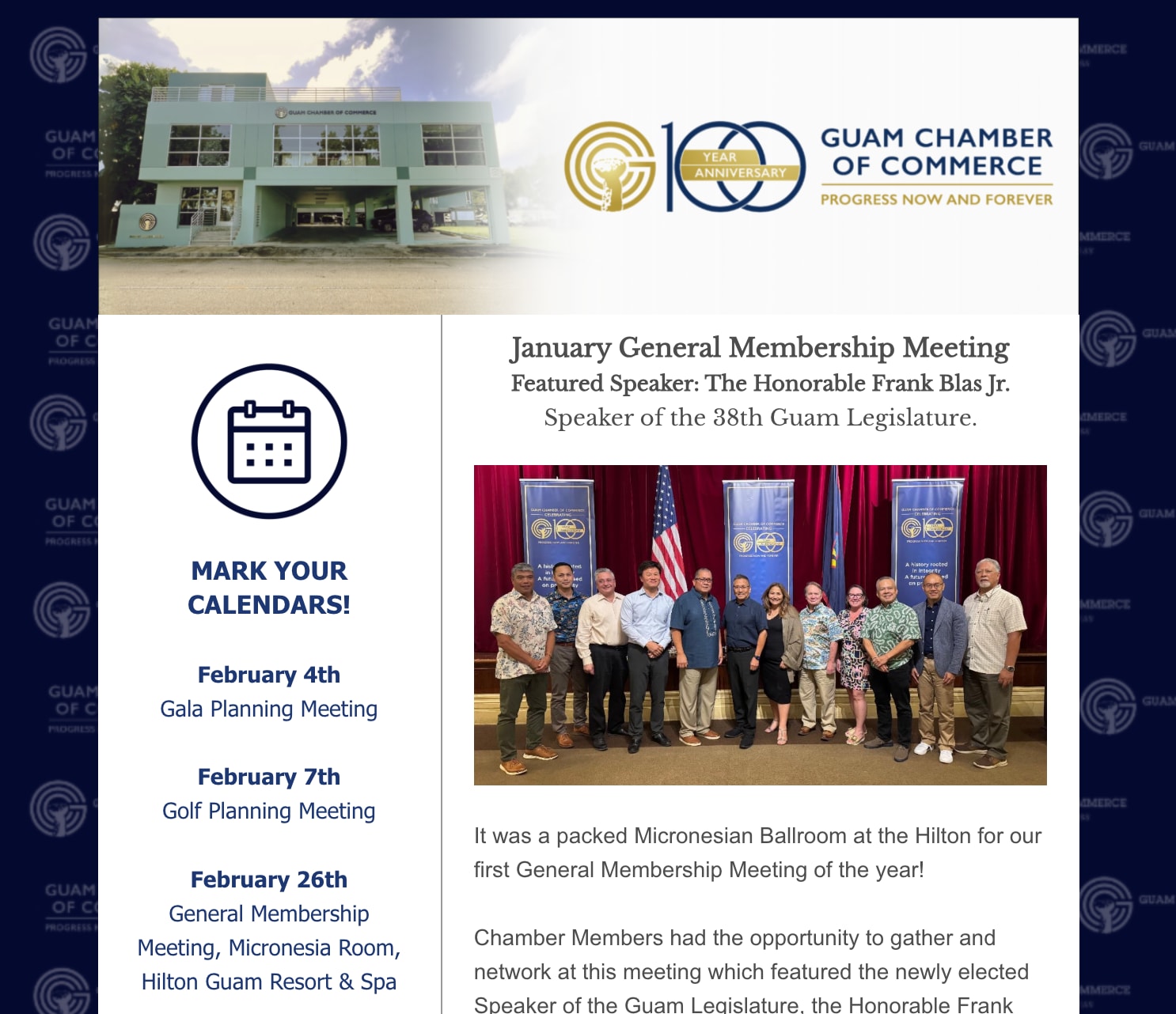 Quick updates to get you ahead next week! - Buh-Bye January 👋🏼 - it was a minute! Back to Chamber News Quick updates to get you ahead next week! - Buh-Bye January 👋🏼 - it was a minute! By Guam Chamber of Commerce 1/31/2025 Saturday, February 1, 2025 Click here to view the newsletter! Images × Share × Email Facebook LinkedIn X Pinterest Powered By GrowthZone