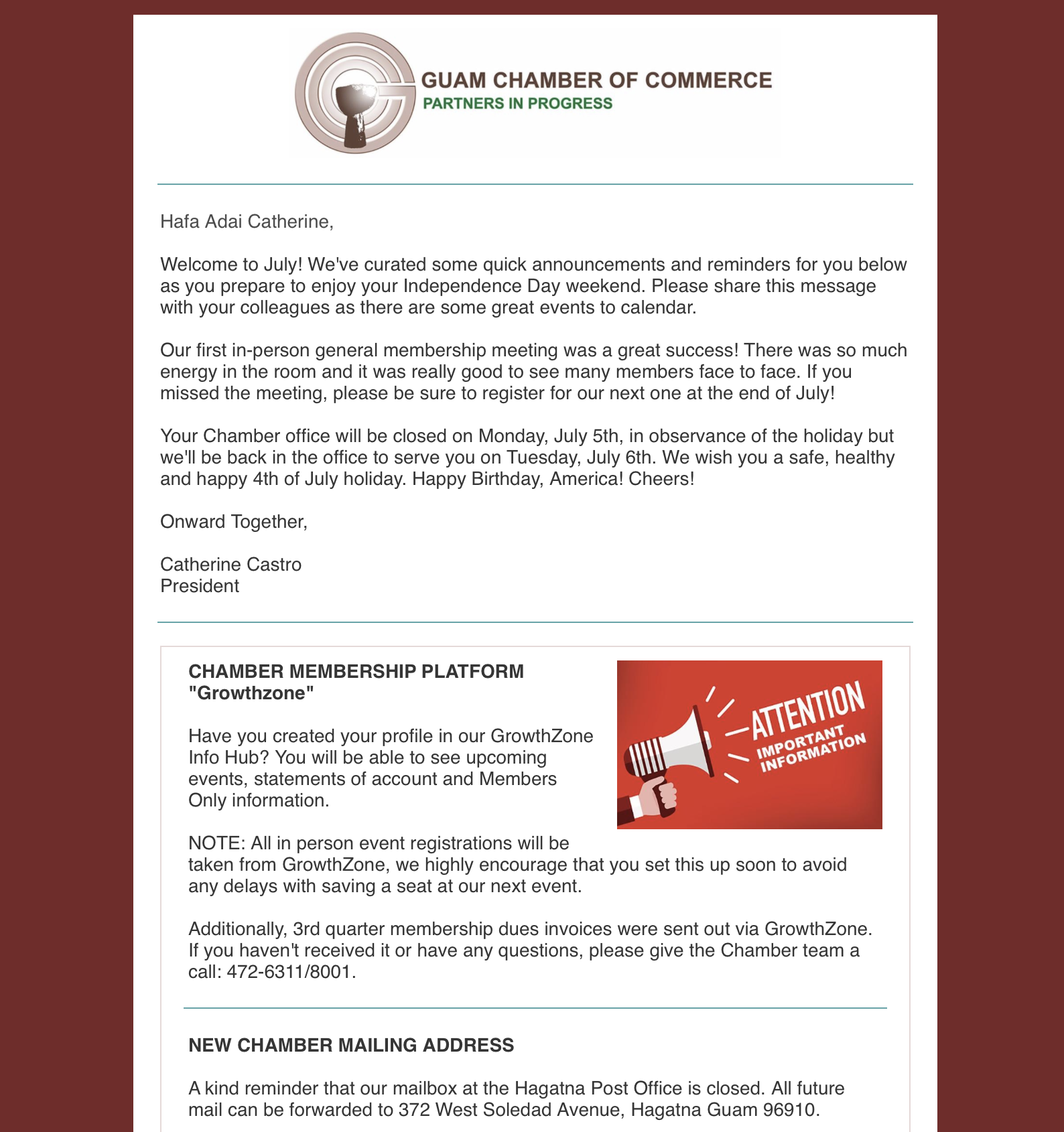 Quick Weekend Updates! Back to Chamber News Quick Weekend Updates! By Guam Chamber of Commerce 7/1/2021 View the newsletter! Images × Share × Email Facebook LinkedIn Twitter Pinterest Powered By GrowthZone