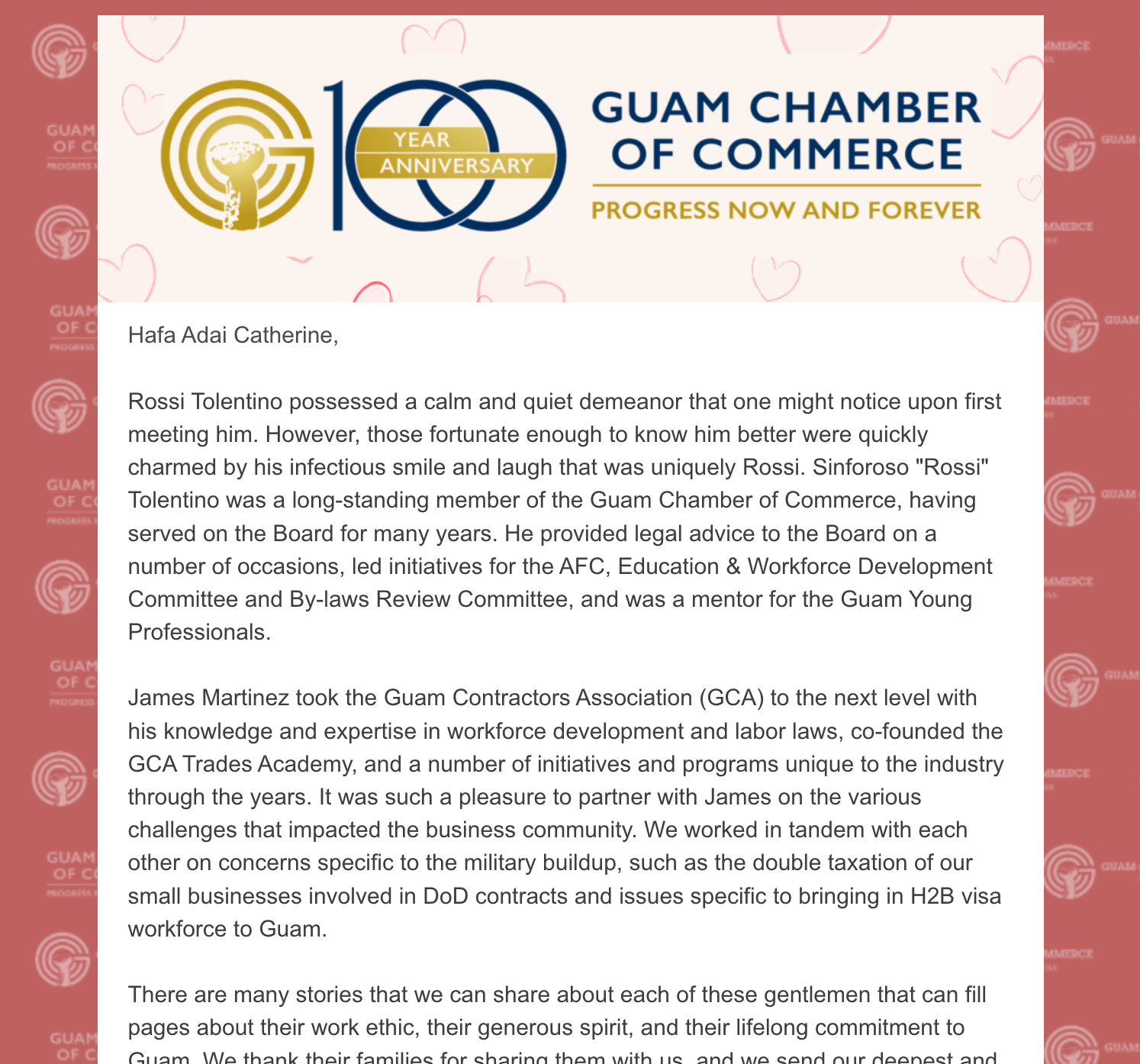 Remembering Rossi & James - Click for Chamber's Weekend Updates Back to Chamber News Remembering Rossi & James - Click for Chamber's Weekend Updates By Guam Chamber of Commerce 2/14/2025 Saturday, February 15, 2025 Click here to view the newsletter! Images × Share × Email Facebook LinkedIn X Pinterest Powered By GrowthZone