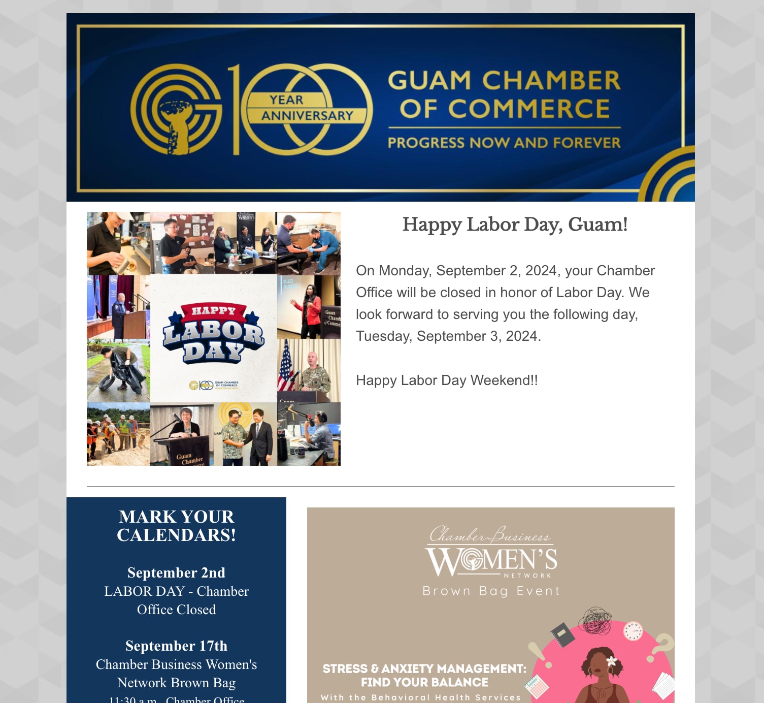 Stay Ahead: Key Updates Just for You! - Happy Labor Day! Back to Chamber News Stay Ahead: Key Updates Just for You! - Happy Labor Day! By Guam Chamber of Commerce 8/30/2024 Saturday, August 31, 2024 Click here to view the newsletter! Images × Share × Email Facebook LinkedIn X Pinterest Powered By GrowthZone
