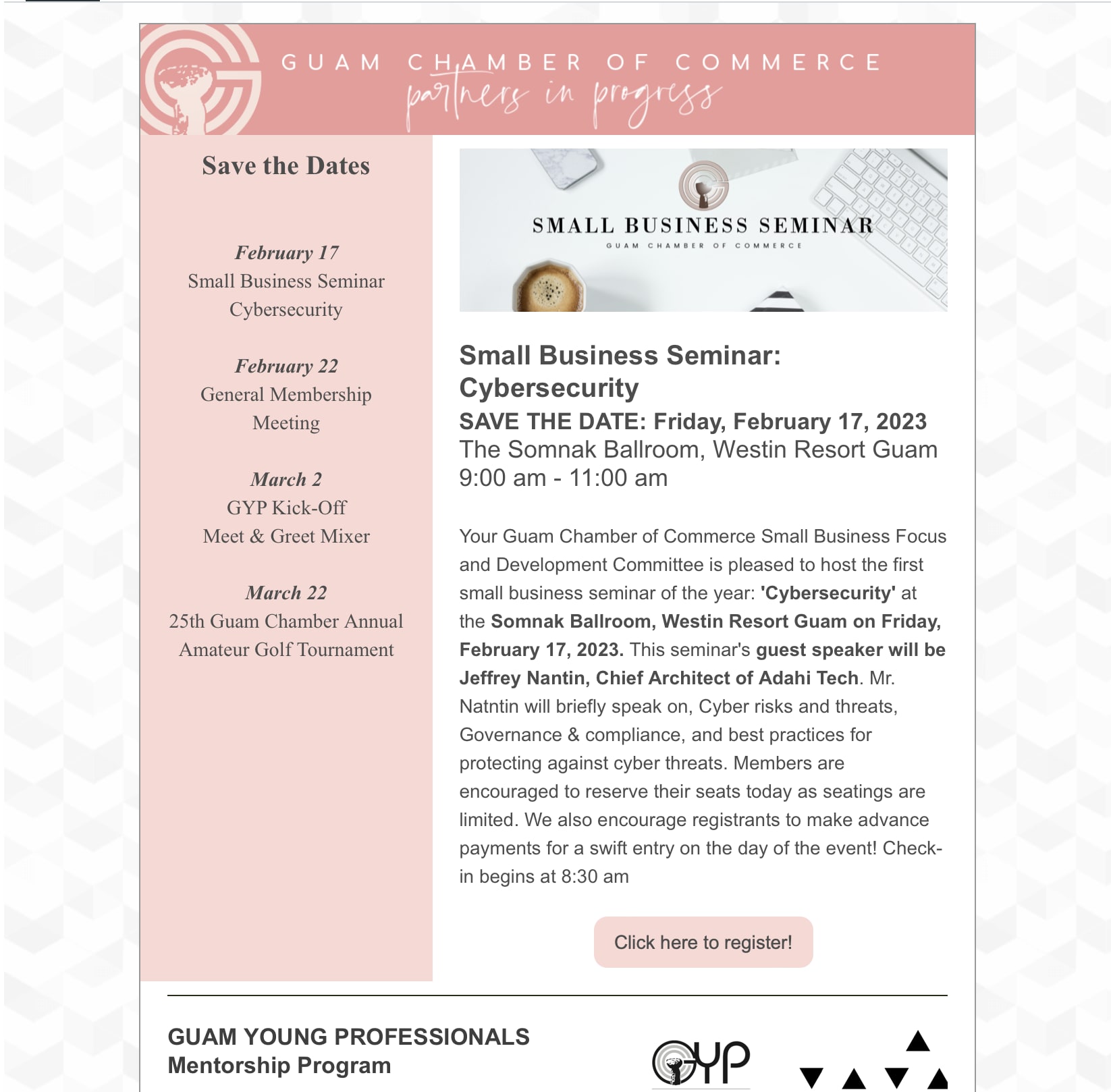 Updates From Your Guam Chamber - Have a Safe Weekend! ☀️ Back to Chamber News Updates From Your Guam Chamber - Have a Safe Weekend! ☀️ By Guam Chamber of Commerce 2/3/2023 February 4, 2023 View the newsletter! Images × Share × Email Facebook LinkedIn X Pinterest Powered By GrowthZone