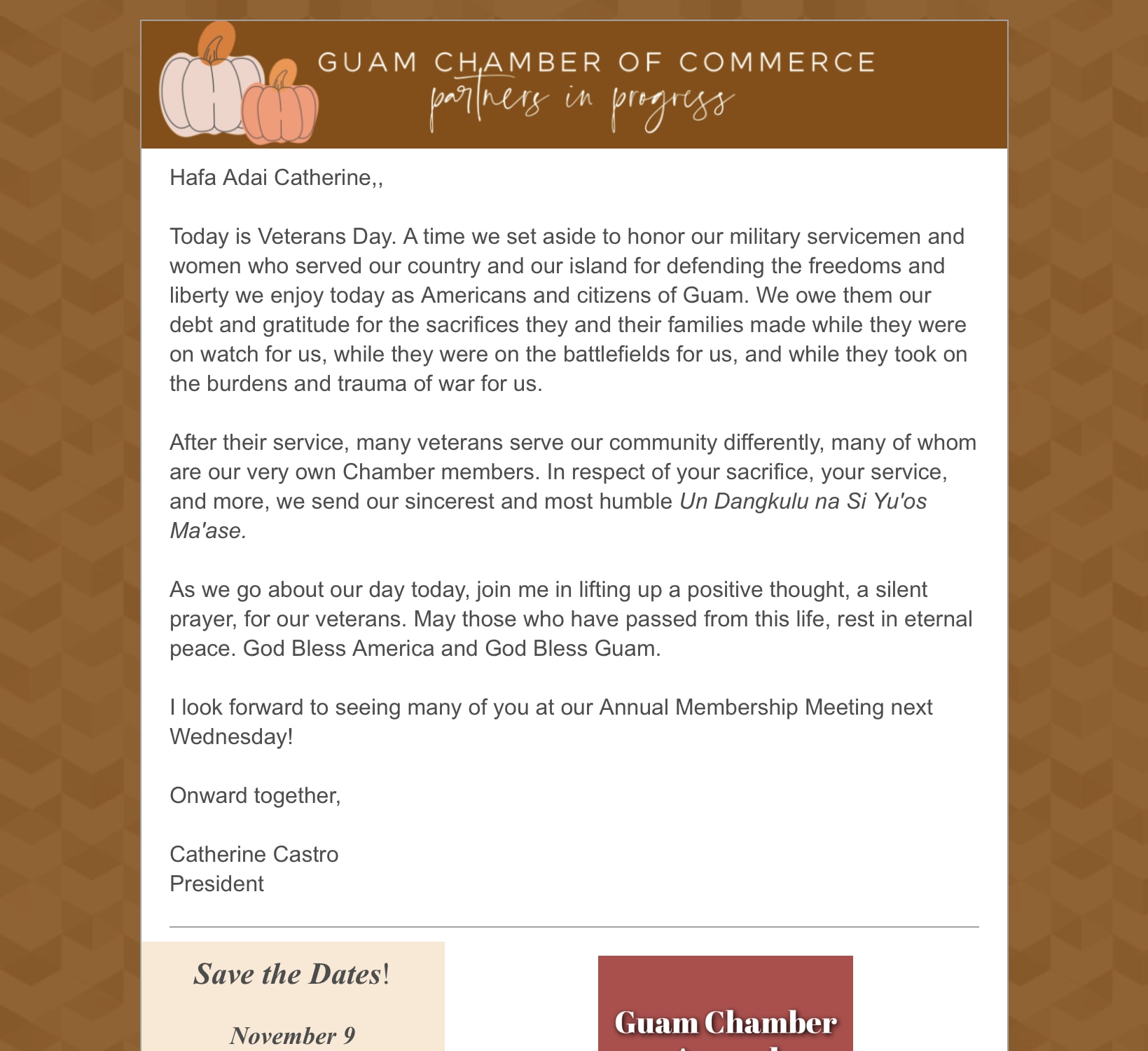 Veteran's Day & Quick Updates - Don't FALL Behind! 🍂 Back to Chamber News Veteran's Day & Quick Updates - Don't FALL Behind! 🍂 By Guam Chamber of Commerce 11/10/2022 November 11, 2022 View the newsletter! Images × Share × Email Facebook LinkedIn X Pinterest Powered By GrowthZone