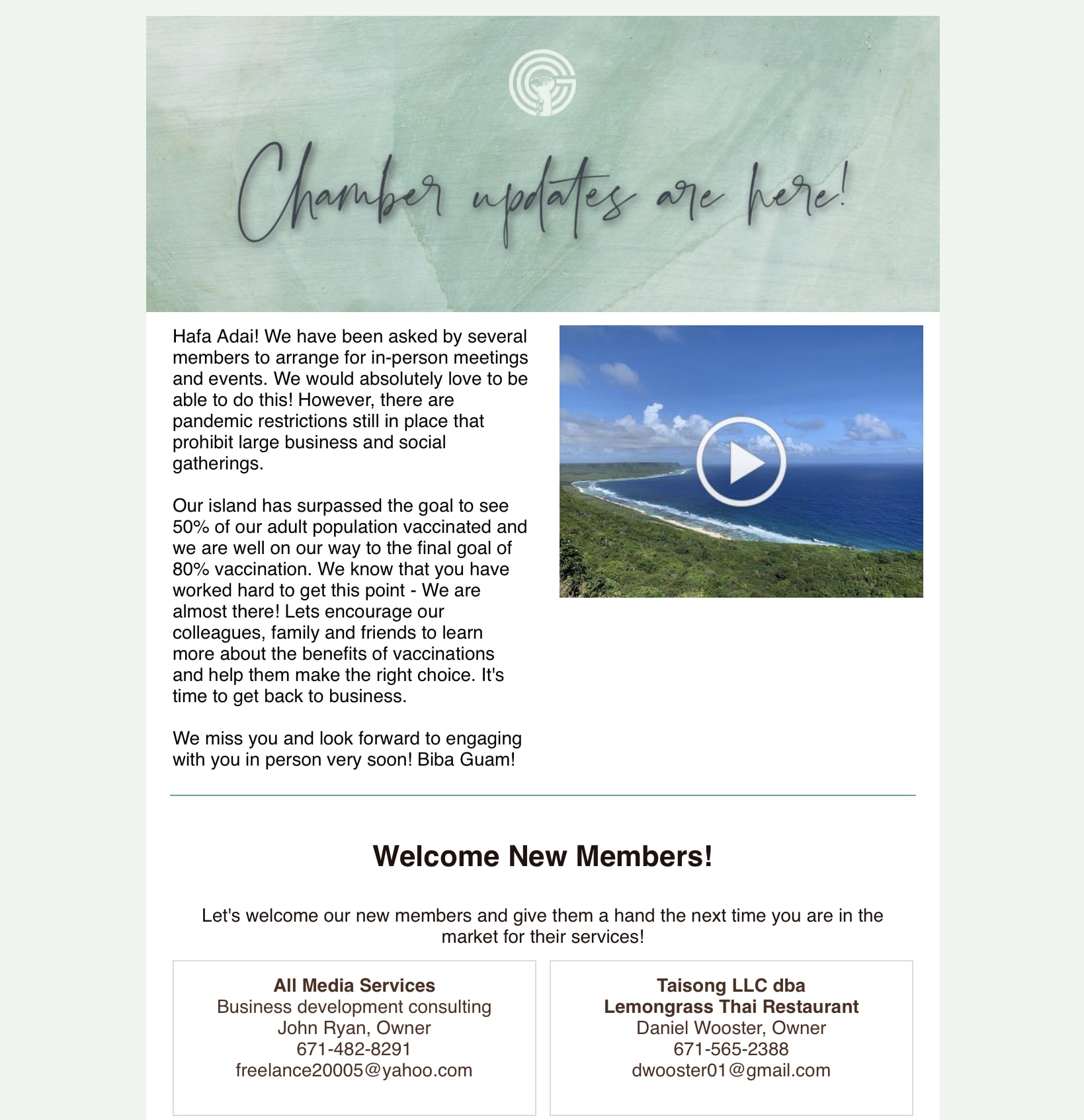 We're lookin out for you! Back to Chamber News We're lookin out for you! By Guam Chamber of Commerce 5/20/2021 May 21, 2021 View the newsletter here! Images × Share × Email Facebook LinkedIn X Pinterest Powered By GrowthZone