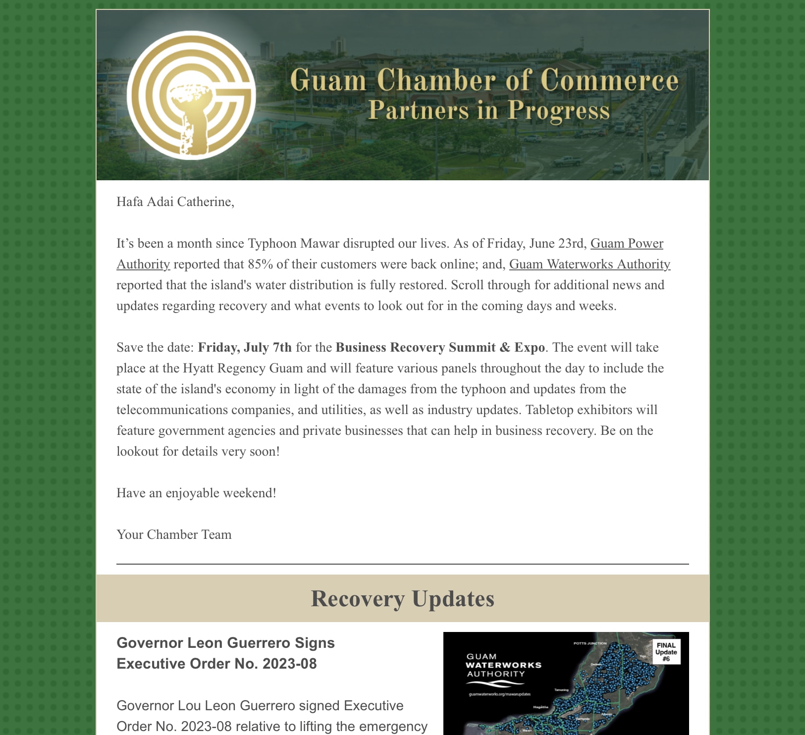 Week 4 Recovery Updates - Action in Progress 🪜🔨🪓🚧🪣🧰 Back to Chamber News Week 4 Recovery Updates - Action in Progress 🪜🔨🪓🚧🪣🧰 By Guam Chamber of Commerce 6/23/2023 Saturday, June 24, 2023 View the newsletter! Images × Share × Email Facebook LinkedIn X Pinterest Powered By GrowthZone