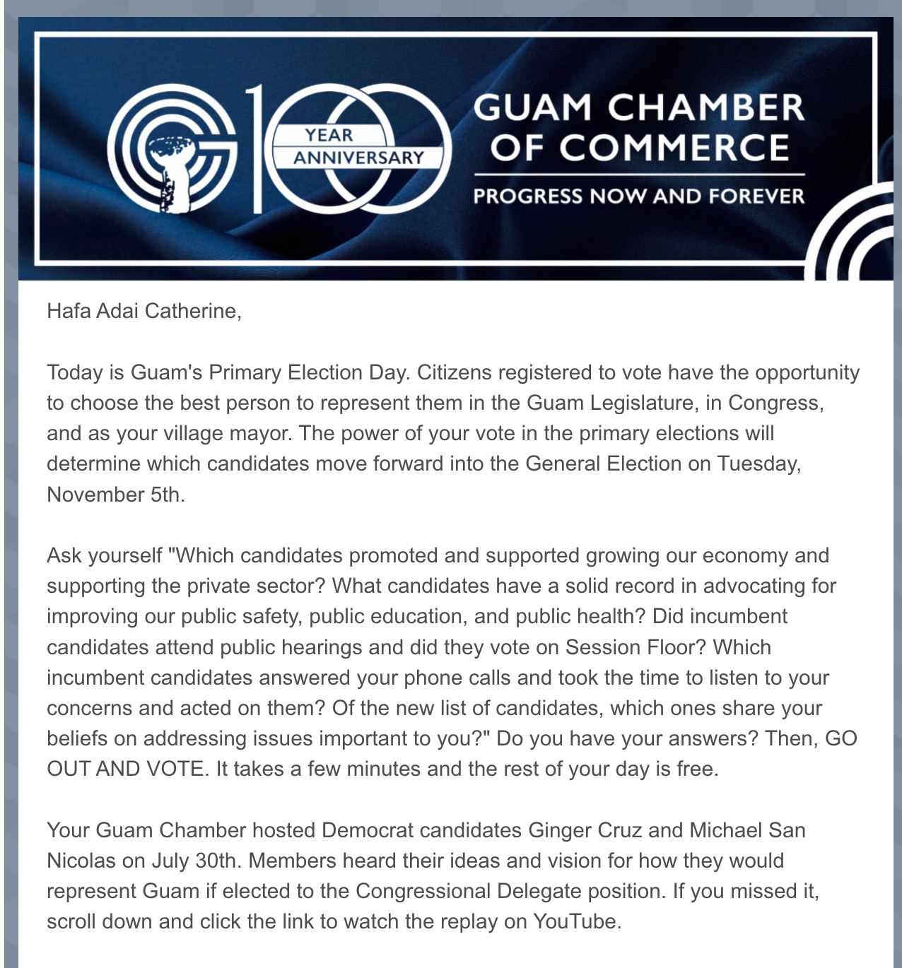 Weekend Info Before Heading To The Polls! 🗳 - Welcome August! Back to Chamber News Weekend Info Before Heading To The Polls! 🗳 - Welcome August! By Guam Chamber of Commerce 8/2/2024 Saturday, August 3, 2024 Click here to view newsletter! Images × Share × Email Facebook LinkedIn X Pinterest Powered By GrowthZone