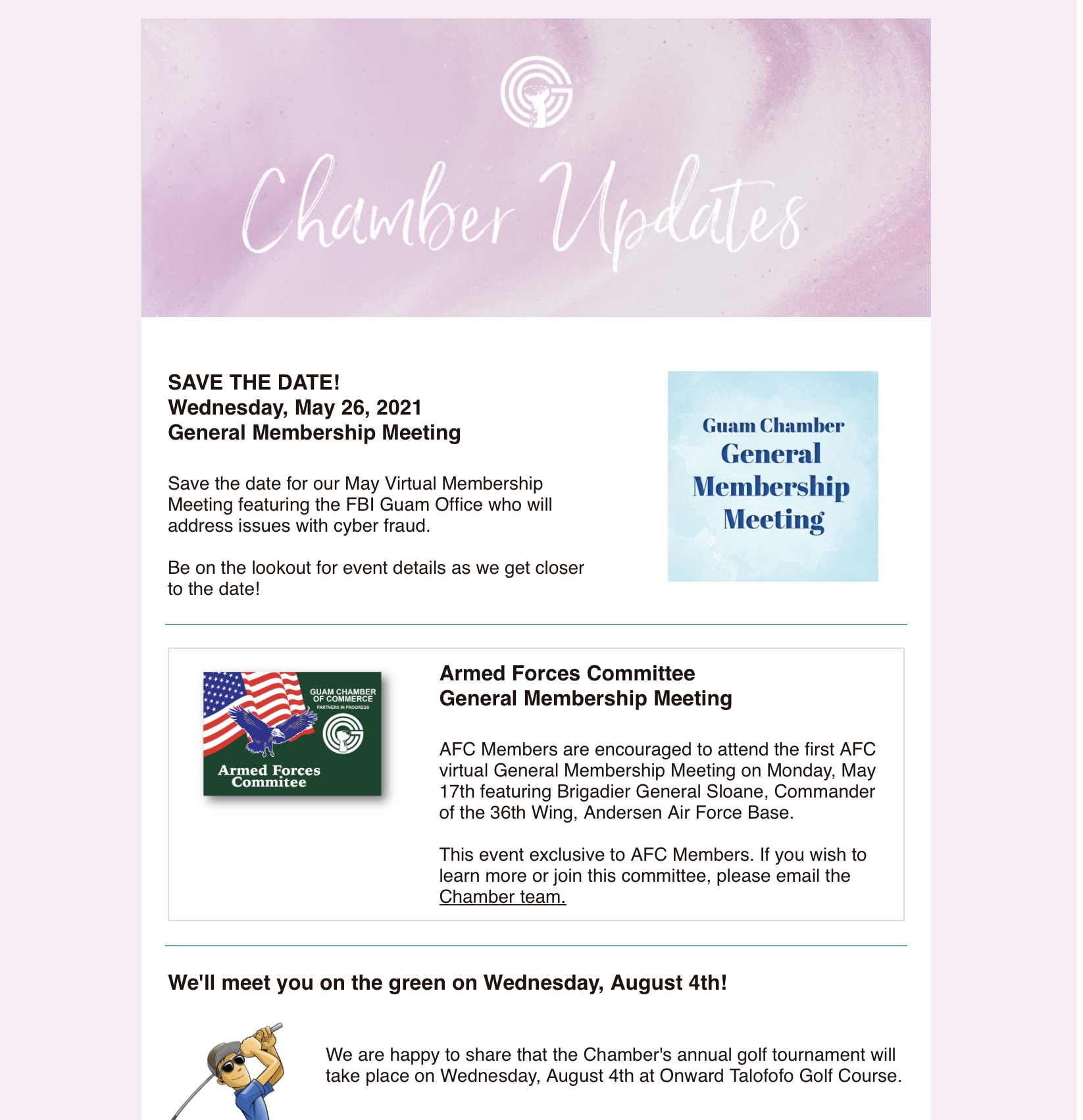 Weekend Updates Back to Chamber News Weekend Updates By Guam Chamber of Commerce 5/7/2021 May 8, 2021 View the newsletter here! Images × Share × Email Facebook LinkedIn X Pinterest Powered By GrowthZone