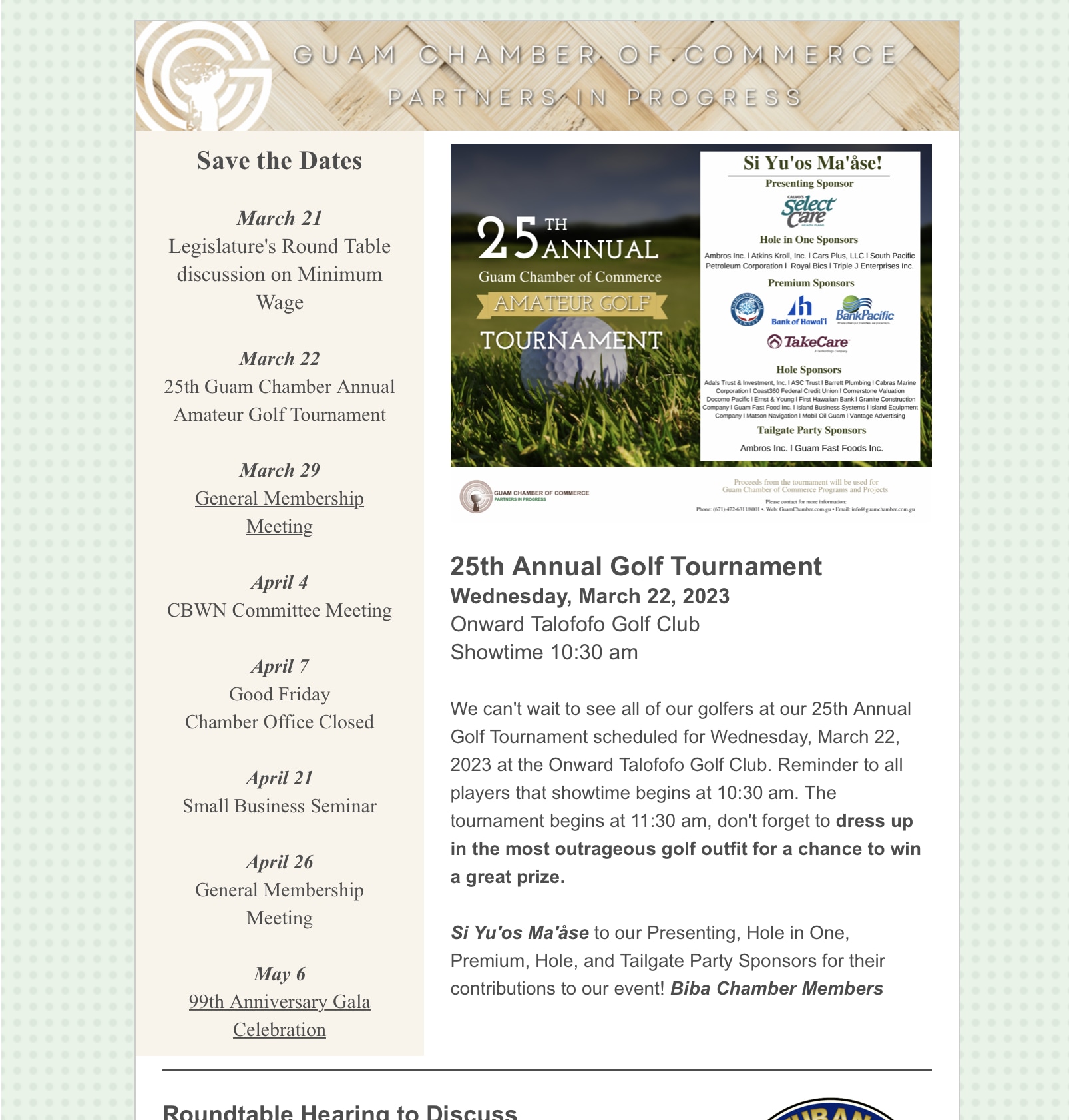 Weekend Updates ⛅️ - Take a peek and plan your week! Back to Chamber News Weekend Updates ⛅️ - Take a peek and plan your week! By Guam Chamber of Commerce 3/17/2023 Saturday, March 18, 2023 View the newsletter! Images × Share × Email Facebook LinkedIn X Pinterest Powered By GrowthZone