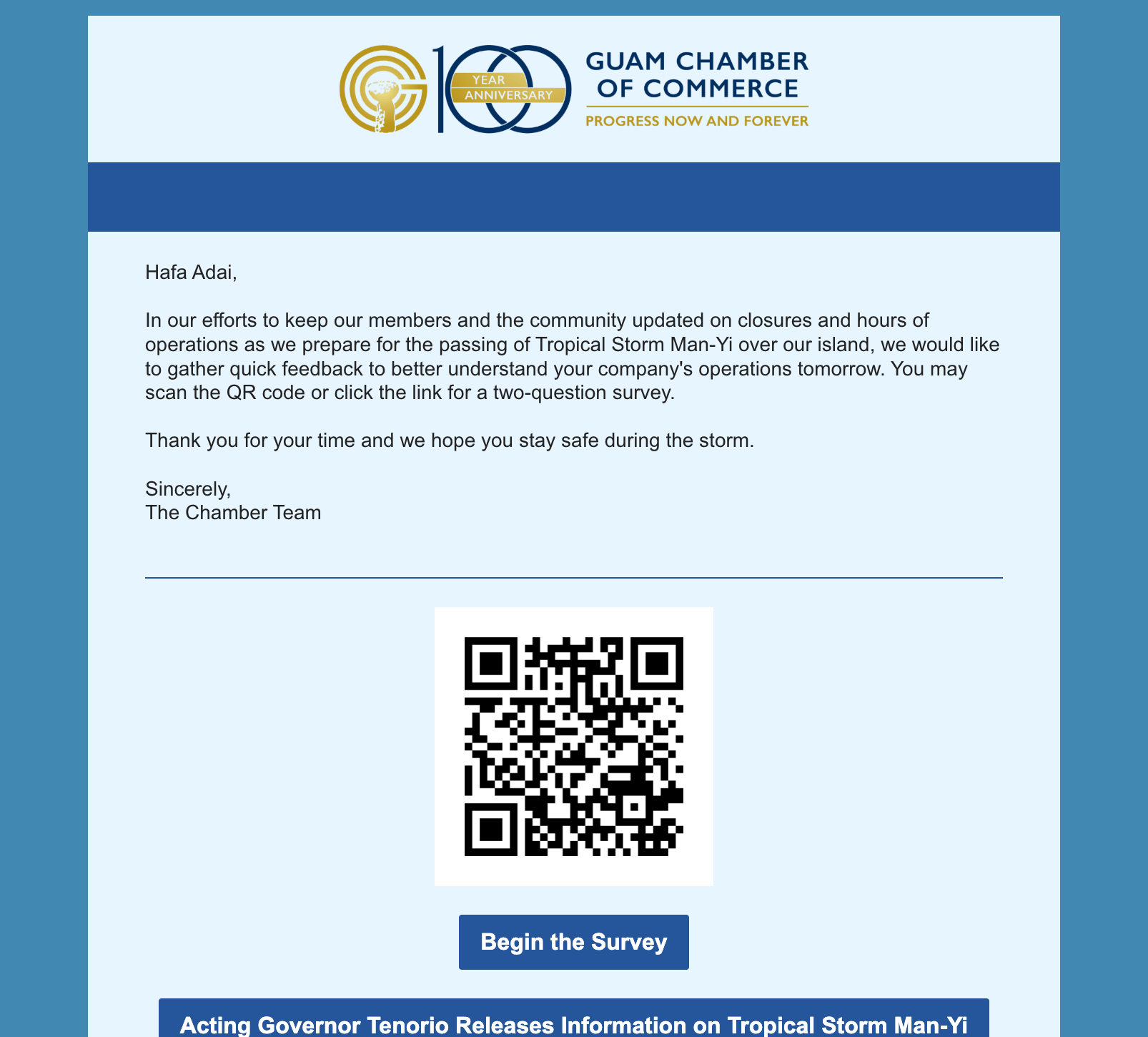 Will Your Company Be Open Tomorrow? - Tropical Storm Man-Yi Back to Chamber News Will Your Company Be Open Tomorrow? - Tropical Storm Man-Yi By Guam Chamber of Commerce 11/11/2024 Tuesday, November 12, 2024 Click here to view! Images × Share × Email Facebook LinkedIn X Pinterest Powered By GrowthZone