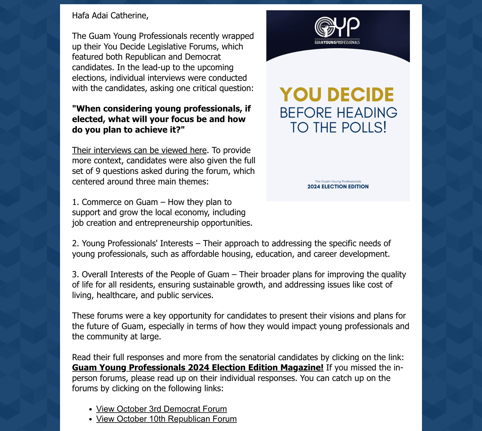 YOU DECIDE before heading to the polls! 🗳 - Your Vote is your Voice! Back to Chamber News YOU DECIDE before heading to the polls! 🗳 - Your Vote is your Voice! By Guam Chamber of Commerce 10/13/2024 Monday, October 14, 2024 Click here to view for more information! Images × Share × Email Facebook LinkedIn X Pinterest Powered By GrowthZone
