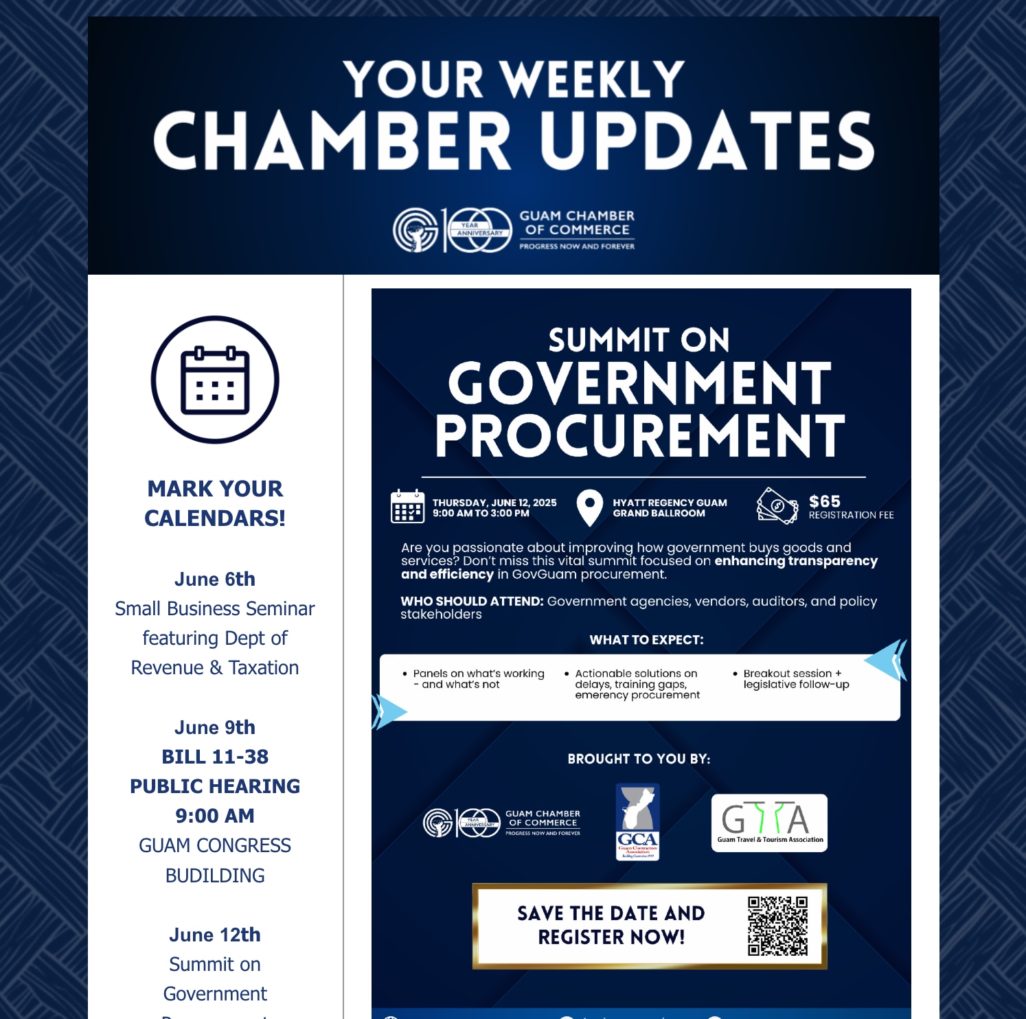 Your Everything Chamber Updates! Back to Chamber News Your Everything Chamber Updates! By Guam Chamber of Commerce 5/30/2025 Saturday, May 31, 2025 Click here to view the newsletter! Images × Share × Email Facebook LinkedIn X Pinterest Powered By GrowthZone