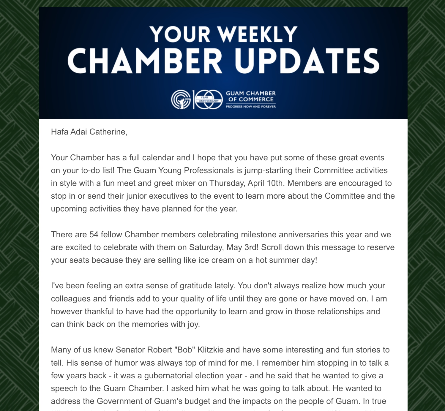 Your everything Chamber Updates! - No Foolin' - It's April! Saturday, April 5, 2025 Back to Chamber News Your everything Chamber Updates! - No Foolin' - It's April! Saturday, April 5, 2025 By Guam Chamber of Commerce 4/4/2025 Saturday, April 5, 2025 Click here to view the newsletter! Images × Share × Email Facebook LinkedIn X Pinterest Powered By GrowthZone