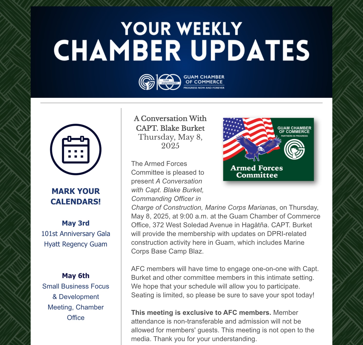 Your Everything Chamber Updates! - Weekly Wrap Up Back to Chamber News Your Everything Chamber Updates! - Weekly Wrap Up By Guam Chamber of Commerce 5/2/2025 Saturday, May 3, 2025 Click here to view the newsletter! Images × Share × Email Facebook LinkedIn X Pinterest Powered By GrowthZone
