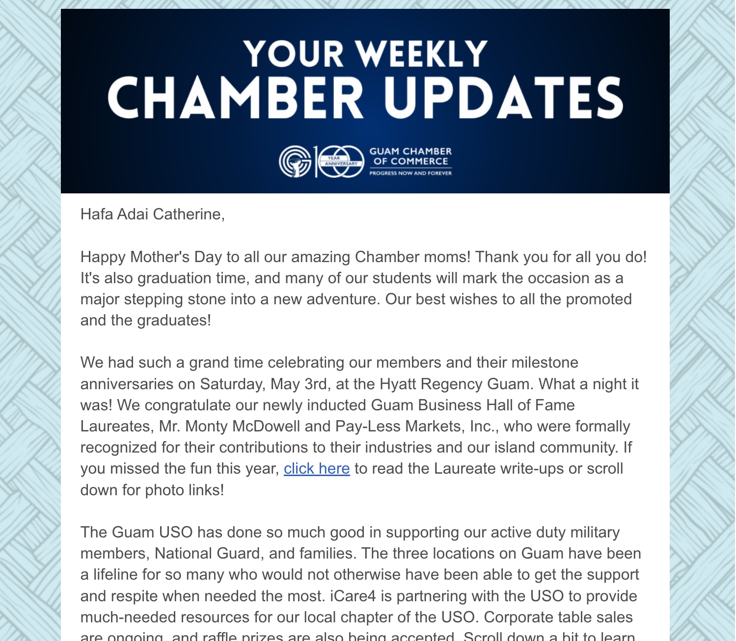 Your Everything Chamber Updates! - Weekly Wrap Up Back to Chamber News Your Everything Chamber Updates! - Weekly Wrap Up By Guam Chamber of Commerce 5/9/2025 Saturday, May 10, 2025 Click here to view the newsletter! Images × Share × Email Facebook LinkedIn X Pinterest Powered By GrowthZone