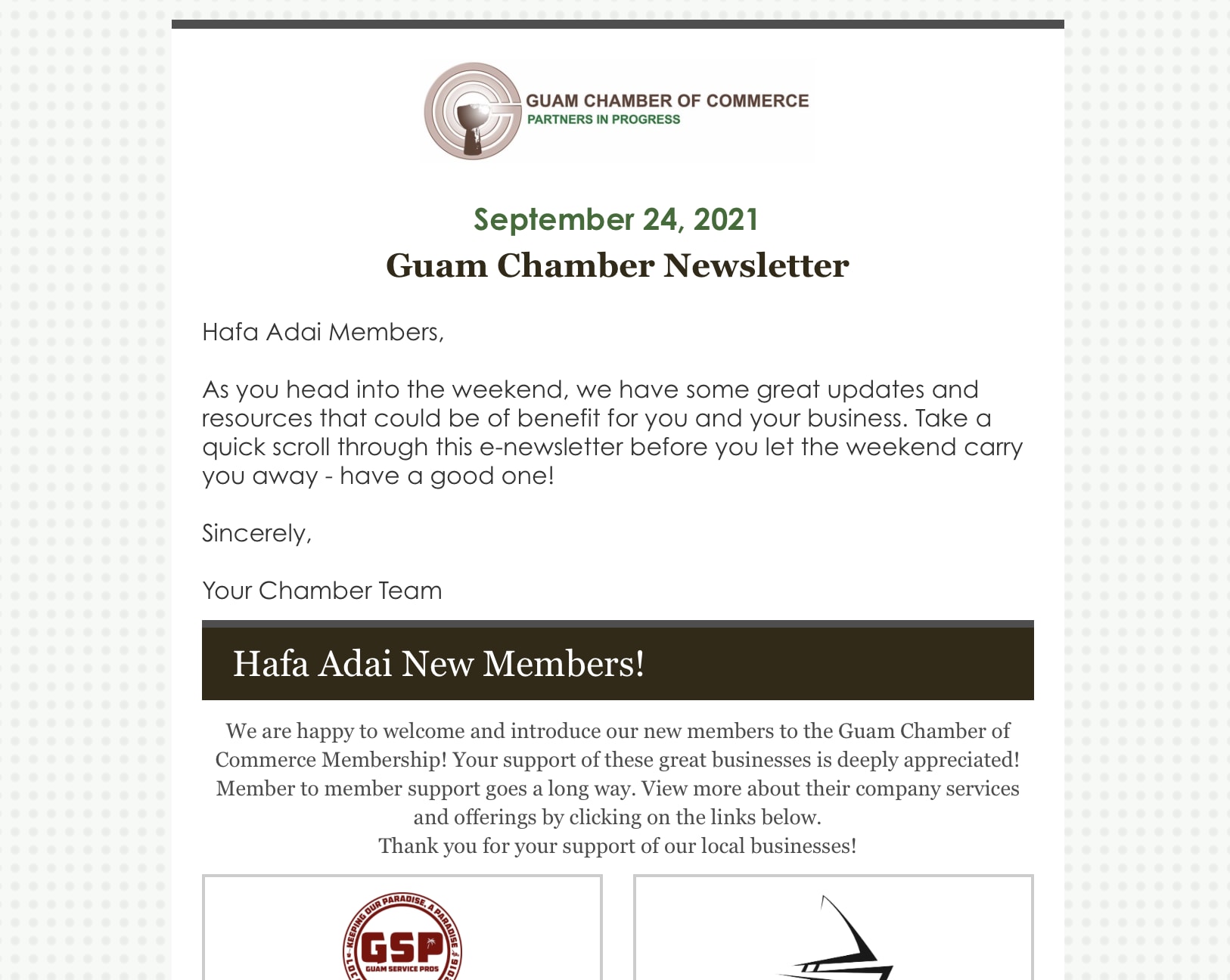 Your last September news Back to Chamber News Your last September news By Guam Chamber of Commerce 9/23/2021 September 24, 2021 View the newsletter here! Images × Share × Email Facebook LinkedIn X Pinterest Powered By GrowthZone