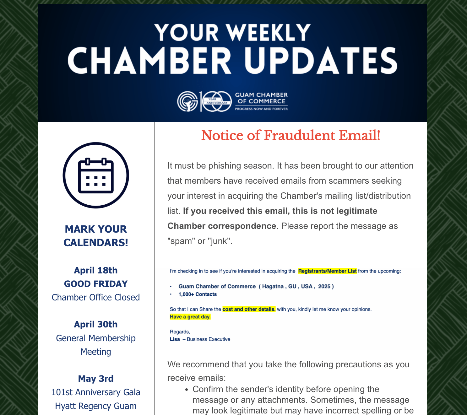 Your Weekly Chamber Updates! Back to Chamber News Your Weekly Chamber Updates! By Guam Chamber of Commerce 4/11/2025 Saturday, April 12, 2025 Click here to view the newsletter! Images × Share × Email Facebook LinkedIn X Pinterest Powered By GrowthZone