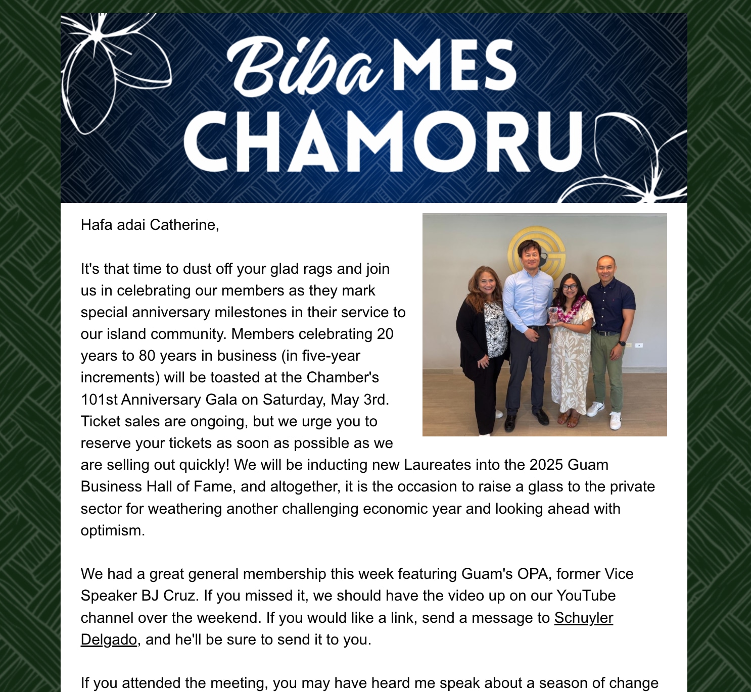 Your weekly dose of everything Chamber and then some! Back to Chamber News Your weekly dose of everything Chamber and then some! By Guam Chamber of Commerce 3/28/2025 Saturday, March 29, 2025 Click here to view the newsletter! Images × Share × Email Facebook LinkedIn X Pinterest Powered By GrowthZone