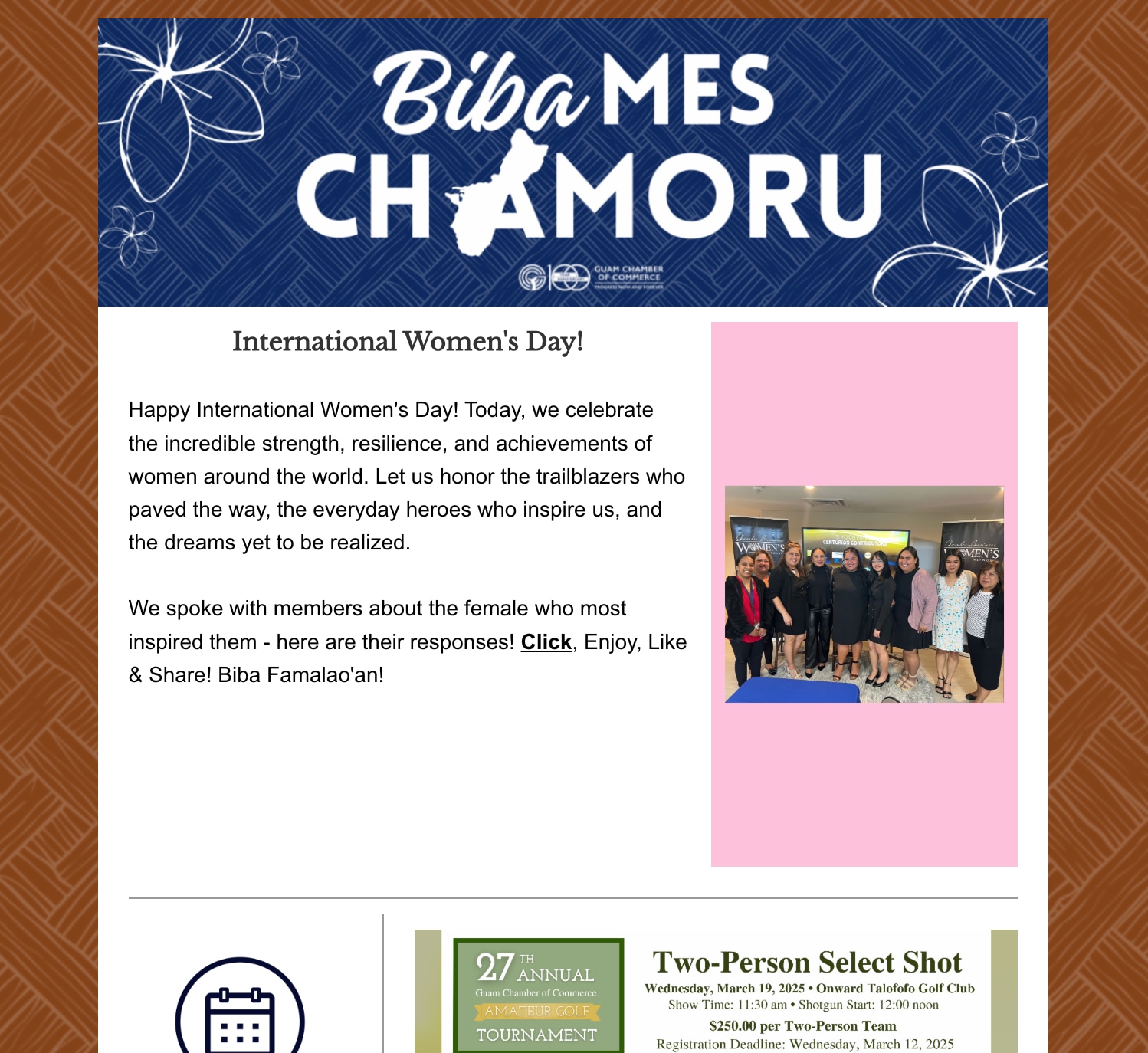 Your weekly dose of everything Chamber! - Biba Mes CHamoru Back to Chamber News Your weekly dose of everything Chamber! - Biba Mes CHamoru By Guam Chamber of Commerce 3/7/2025 Saturday, March 8, 2025 Click here to view the newsletter! Images × Share × Email Facebook LinkedIn X Pinterest Powered By GrowthZone