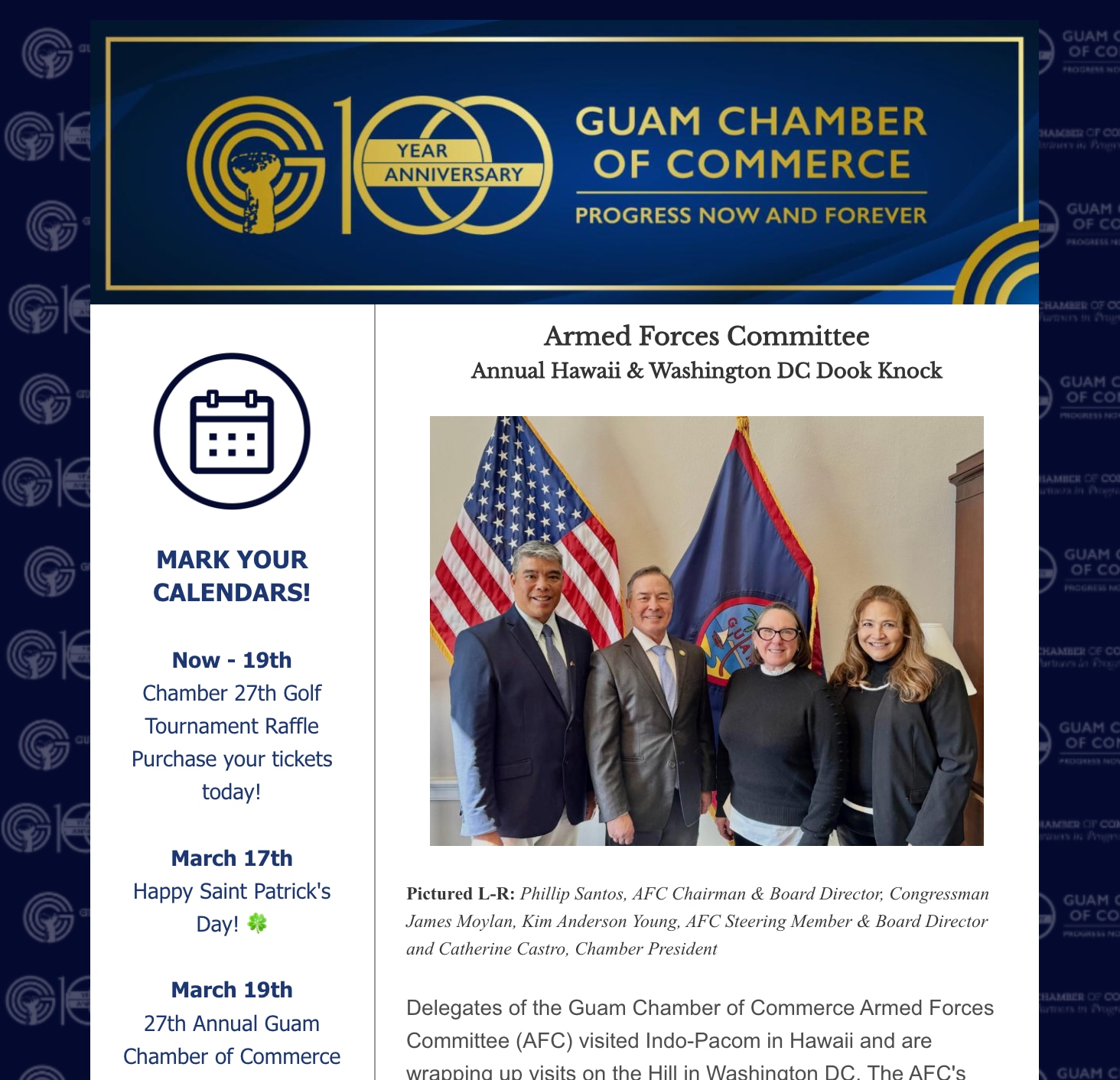 Your weekly dose of everything Chamber! - Don't forget your coffee! ☕️ Back to Chamber News Your weekly dose of everything Chamber! - Don't forget your coffee! ☕️ By Guam Chamber of Commerce 2/28/2025 Saturday, March 1, 2025 Click here to view the newsletter! Images × Share × Email Facebook LinkedIn X Pinterest Powered By GrowthZone