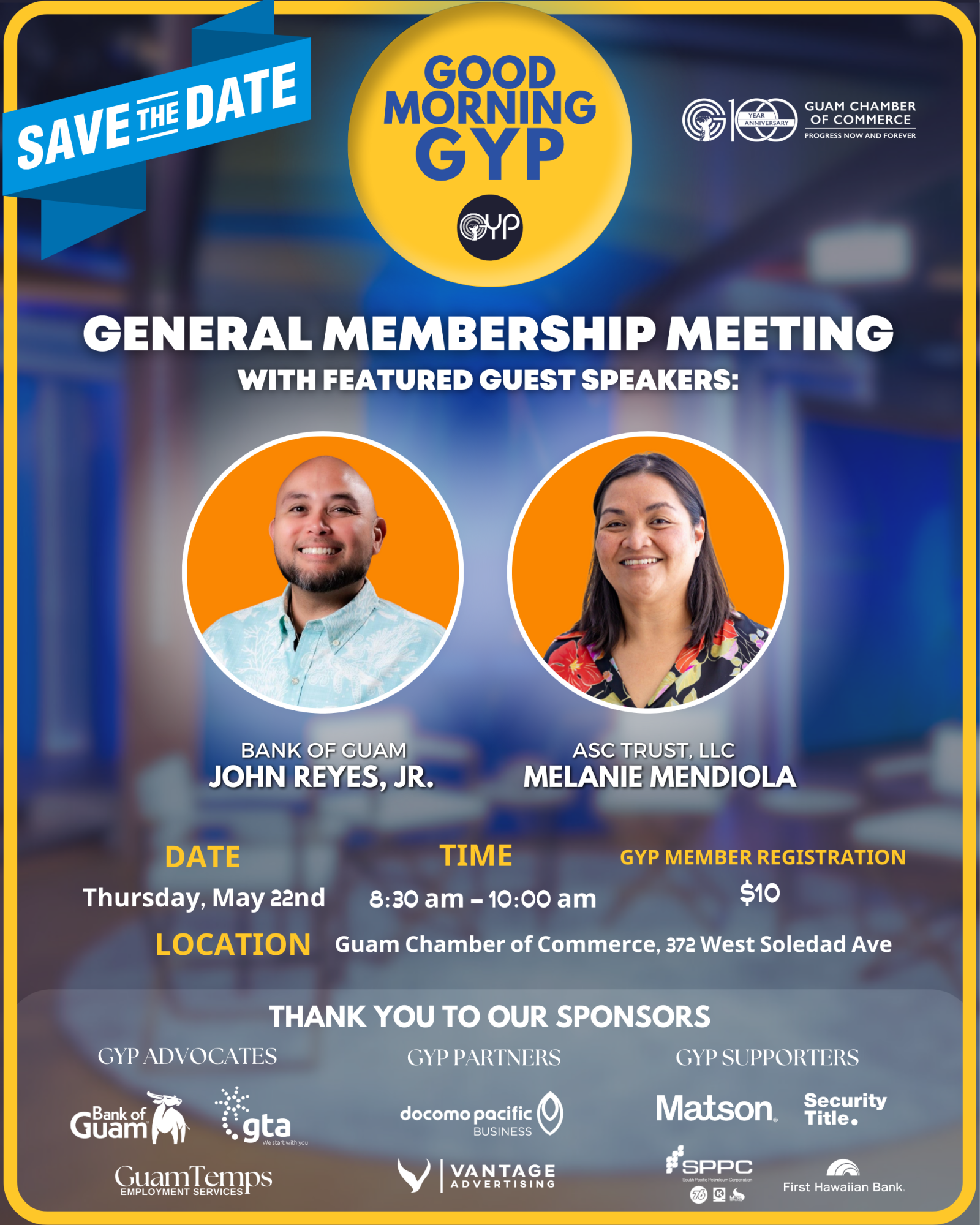 Your Guam Young Professionals, a Committee of the Guam Chamber of Commerce, is pleased to present their first General Membership Meeting of the year scheduled for Thursday, May 22, 2025, at the Guam Chamber of Commerce office in Hagåtña from 8:30 am to 10:00 am.