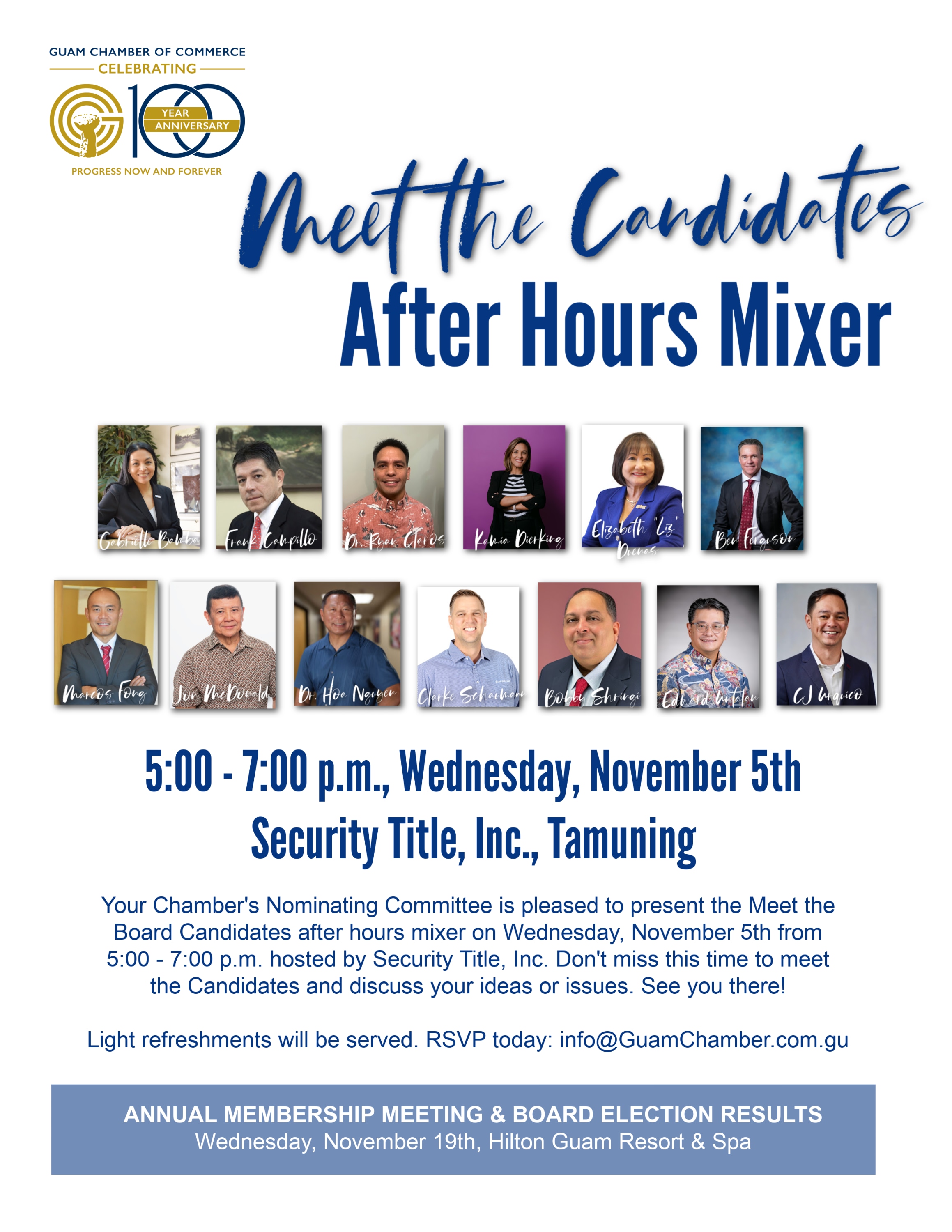 Meet your Chamber Board Candidates at Security Title on Wednesday, November 5th! The fun begins at 5 pm and wraps up at 7 pm.