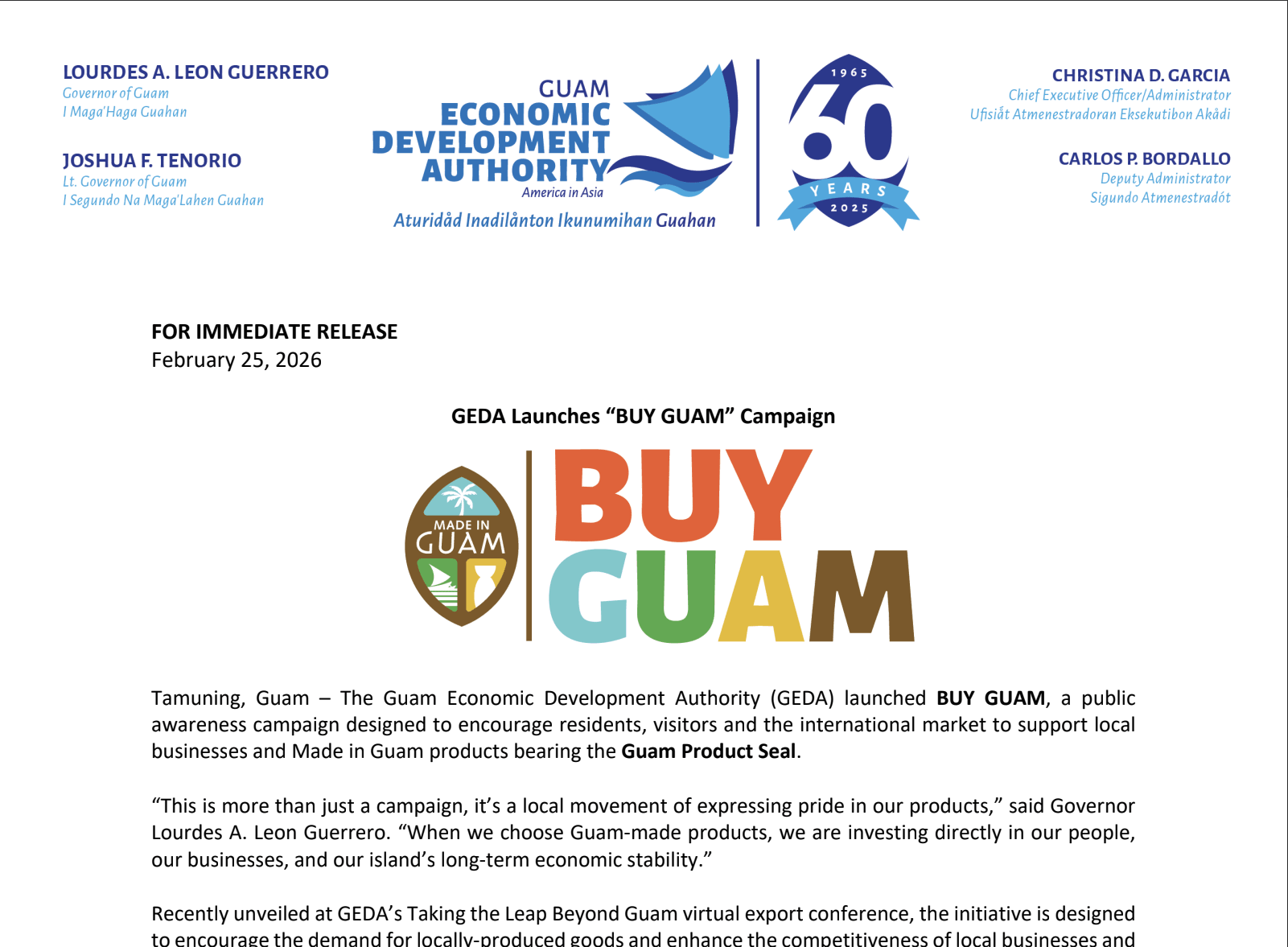 Recently unveiled at GEDA’s Taking the Leap Beyond Guam virtual export conference, the initiative is designed to encourage the demand for locally-produced goods and enhance the competitiveness of local businesses and entrepreneurs. The campaign will feature and celebrate Guam-based manufacturers and producers, highlighting the quality, creativity, and innovation behind local products. Through television, digital media, and community outreach, BUY GUAM aims to make choosing local the easy and preferred choice.
